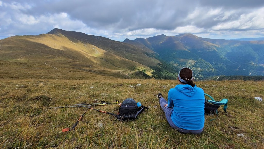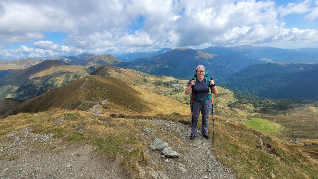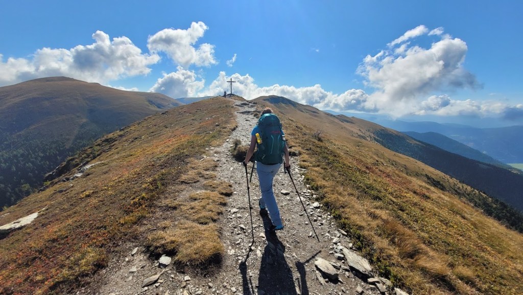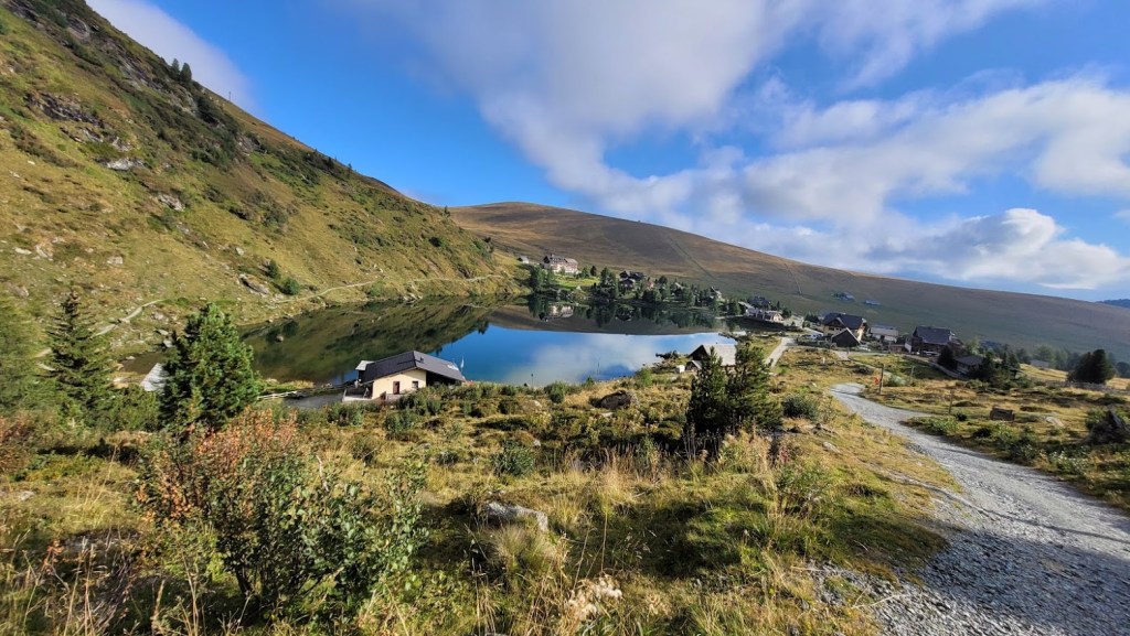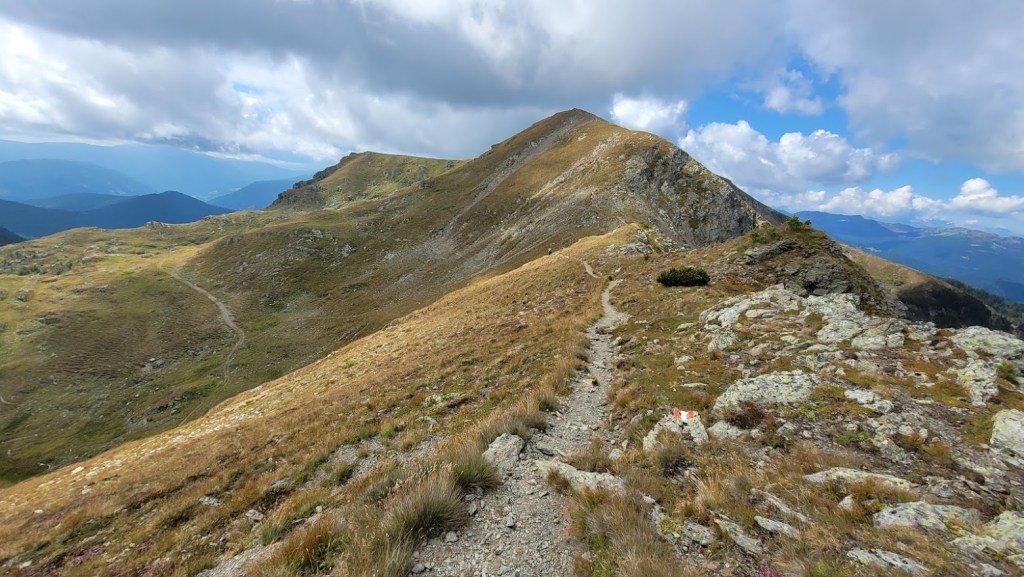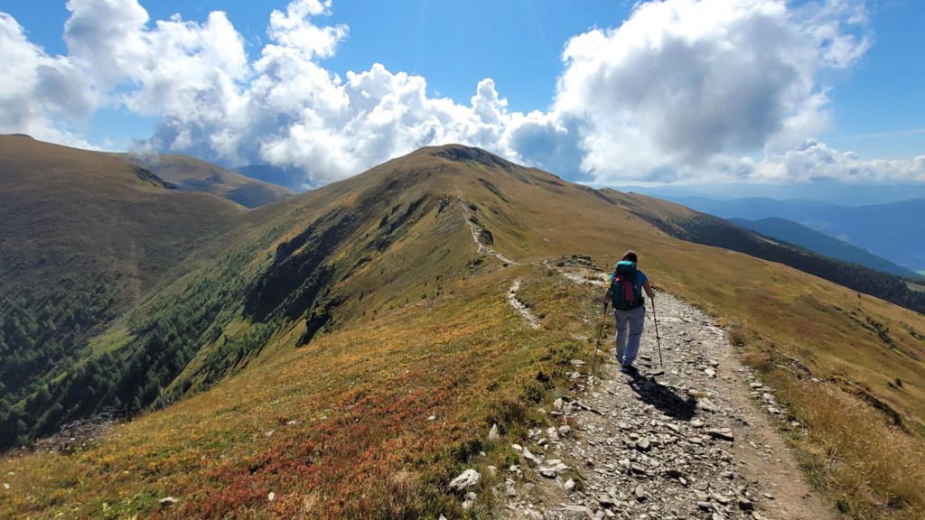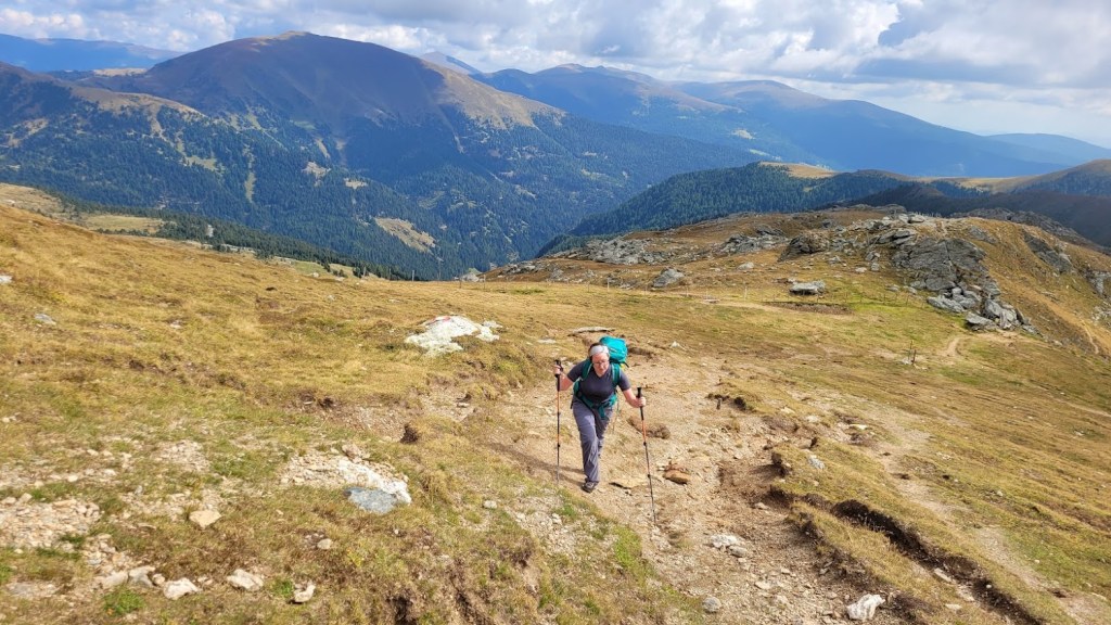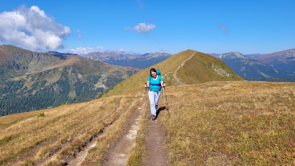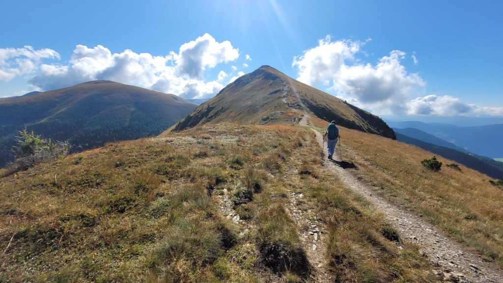 Nockberge so pogorje v Krških Alpah, ki je znano po čudovitih travnatih “kupčkastih” hribih. Pobočja teh gora pozimi ponujajo skorajda neomejeno možnosti za lovljenje pršiča. Zato sem bil doslej v Nockbergih večinoma samo v mrzlem letnem času. Tokrat pa sva se s punco odpravila raziskovat te gore poleti. Za prvi dan sva si za izhodišče izbrala prelaz Turracher Höhe (1795 m). Najprej sva se po smučišču povzpela na Schoberriegel (2208 m). Nato sva dalj časa sledila gorskemu slemenu sledila prek vrhov Gruft (2230 m), Kaser Höhe (2318 m), Hoazhöhe (2319 m) na goro Brethöhe (2320 m). Pot je ves čas čudovita in zelo razgledna. Zaradi mahu in borovničevja pa je pot neverjetno mehka. Zato ni presenetljivo, da sva srečala planince, ki so hodili bosi. Tudi jaz bi, če bi bilo kakšno stopinjo toplejše vreme. Nazaj na izhodišče sva se vrnila prek planin Zgartenalm in Hochkaser. Prehodila sva 19 km in se vzpela samo za 1100 višincev, kar pomeni da sva res večinoma hodila samo po ravnem.
