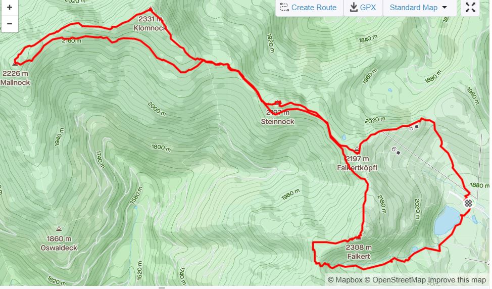 Po prenočitvi v Bad Kleinkirchheimu sva se naslednji zapeljala na planino Heidialm pri jezeru Falkertsee. Najprej sva se za ogrevanje povzpela na Falkert (2308 m). Nato pa sva obredla vrhove nad St. Ostwaldom: Steinnock (2197 m), Klomnock (2331 m), Mallnock (2216 m) in nazadnje še Falkertköpfl (2197 m). Tudi tokrat omembe vrednih klancev ni bilo. Ker pa sva ves čas hodila po grebenu, sva imela ves čas lep razgled na skorajda neskončno številne vrhove v Nockbergih, Nockalmsko cesto in Hochalmspitze.