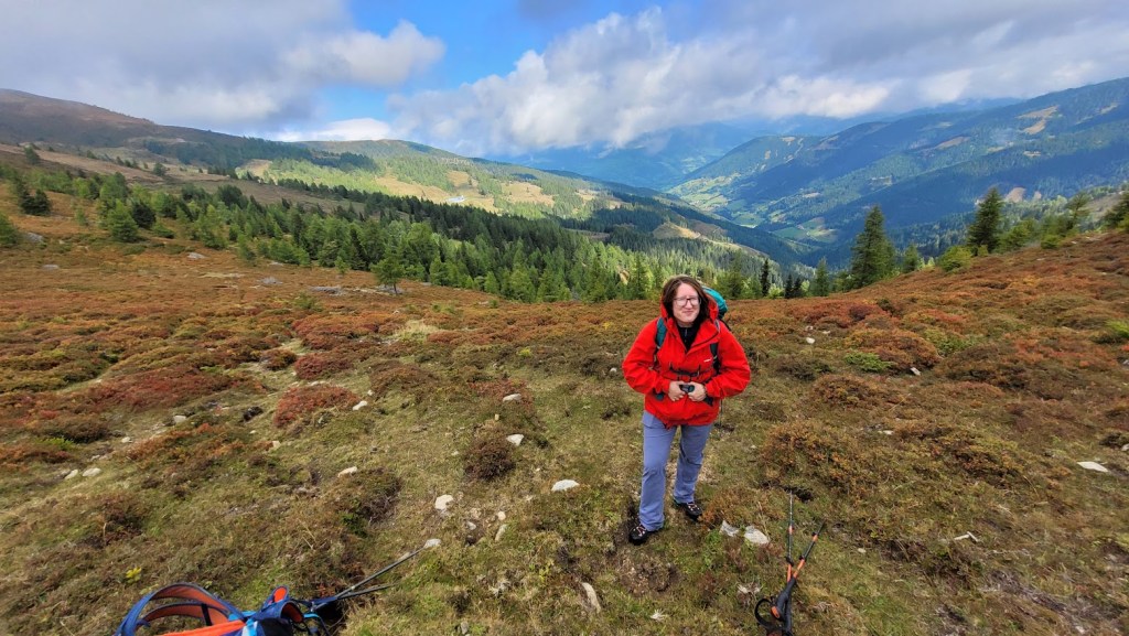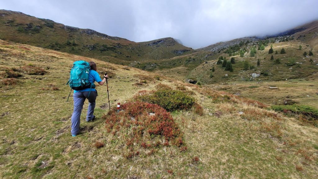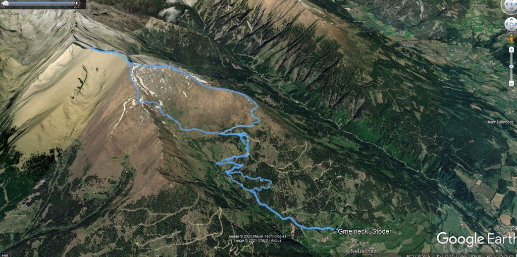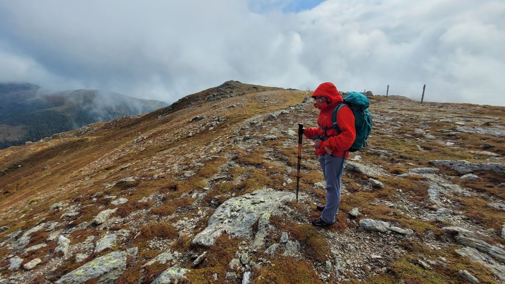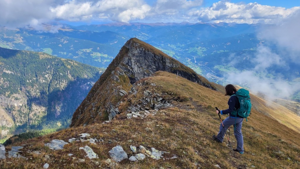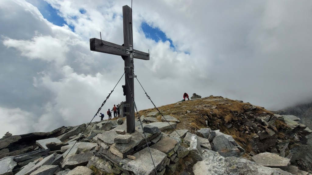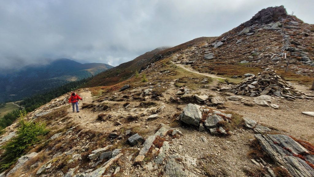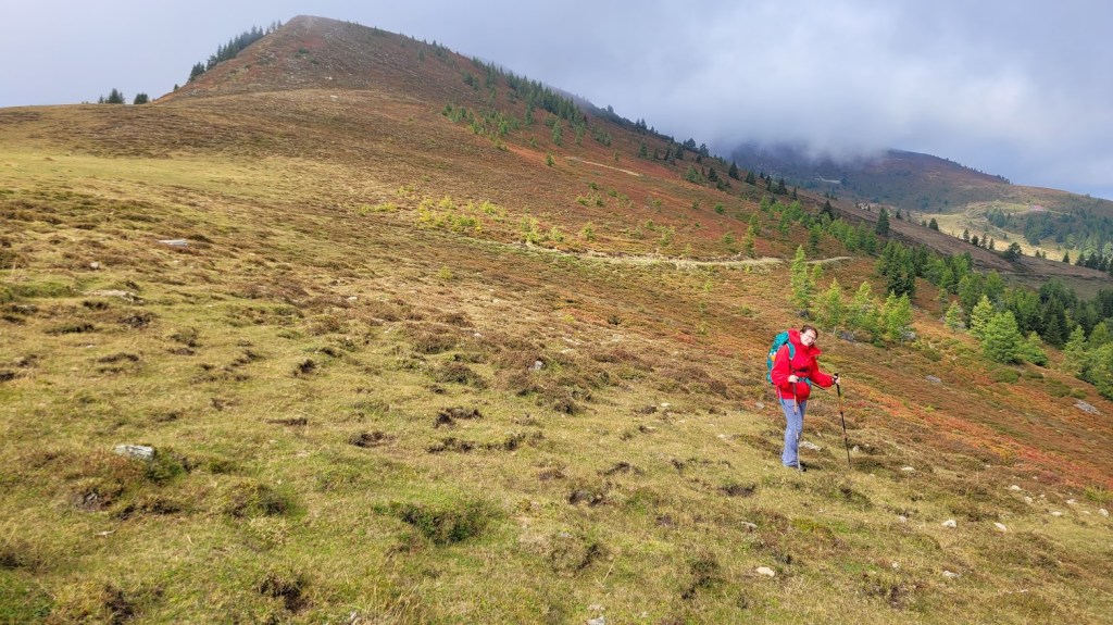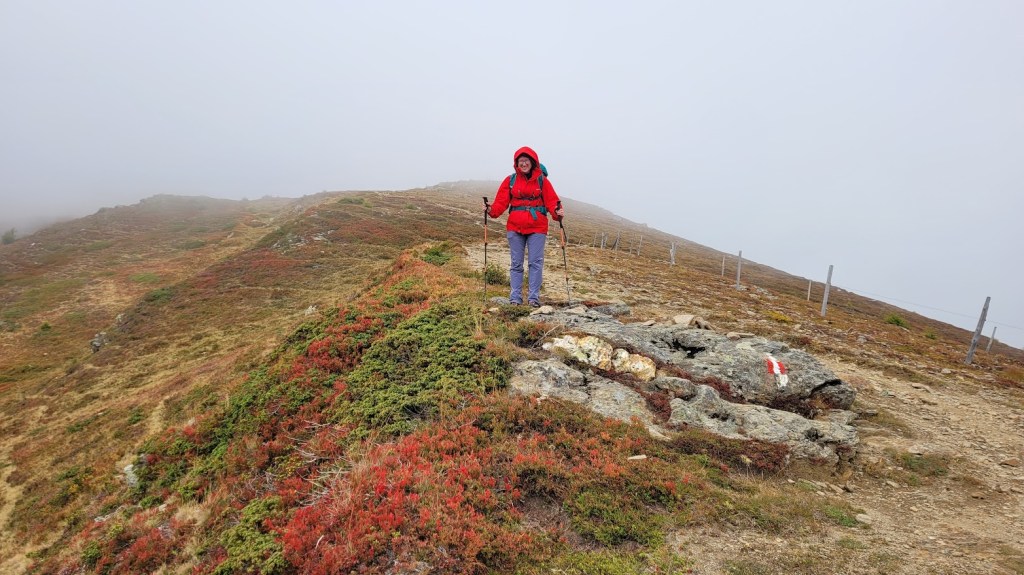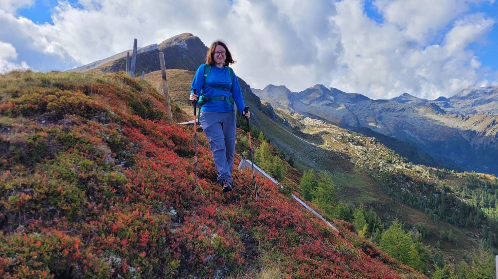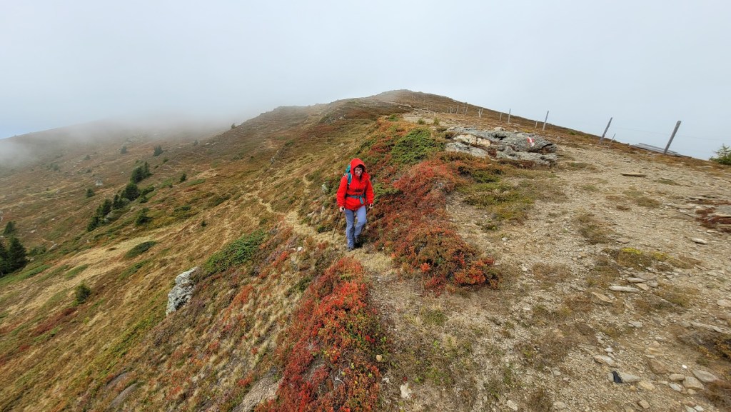 Končno spet za vikend “na lepše” v Avstrijo v hribe. V soboto sva si za cilj izbrala Gmeineck, 2592 m visoko goro na jugovzhodnem delu pogorja Ankogelgruppe, ki sem jo pozimi že smučal. Gore v poletno-jesenski preobleki, pa še nisem obiskal. Za izhodišče sva izbrala vas Neushitz (1150 m) nad Gmündom. Tik nad vasjo je zapornica, kjer je treba plačati 6 € cestnine za (makadamsko) gorsko cesto do koče Bergfriedhütte (1775 m). Midva se nisva želela peljati po cesti, ampak sva cestnino vseeno plačala, ker pred zapornico nisva našla parkirnega prostora. Po bližnjicah in kolovozih sva se tako peš odpravila do omenjene koče. Nato pa naprej po običajni markirani poti do vrha Gmeinecka. Žal pretiranih razgledov zaradi megle nisva bila deležna. Z vrha gore sva sestopila po poti čez Stoder (2433 m). Do Stodra vodi čudovita grebenska zavarovana pot. Vmes se je vreme tudi toliko izboljšalo, da sva končno lahko uživala v razgledih. Tudi gorski travniki so se odeli v značilne rdeče barve jeseni.