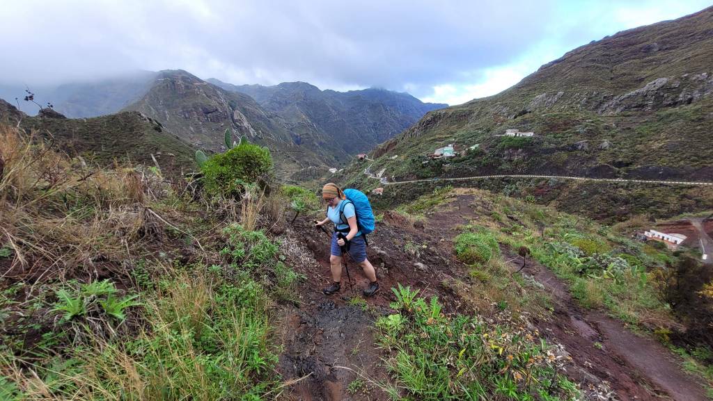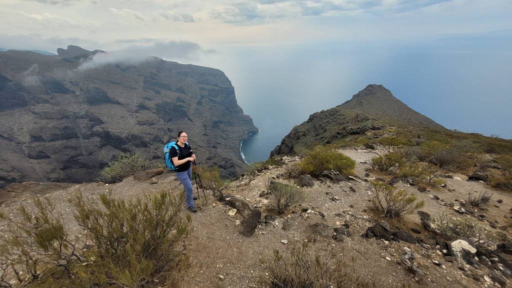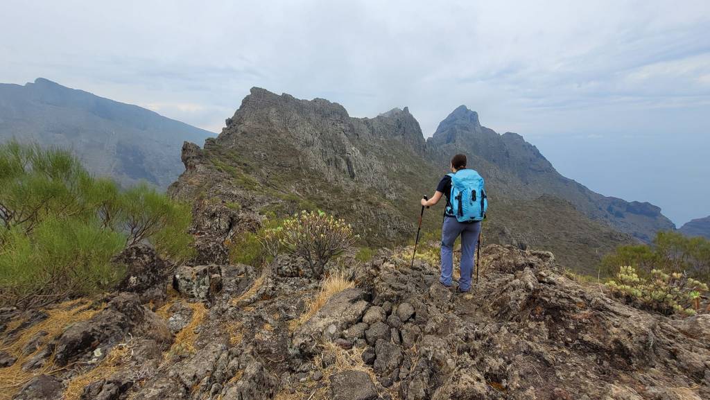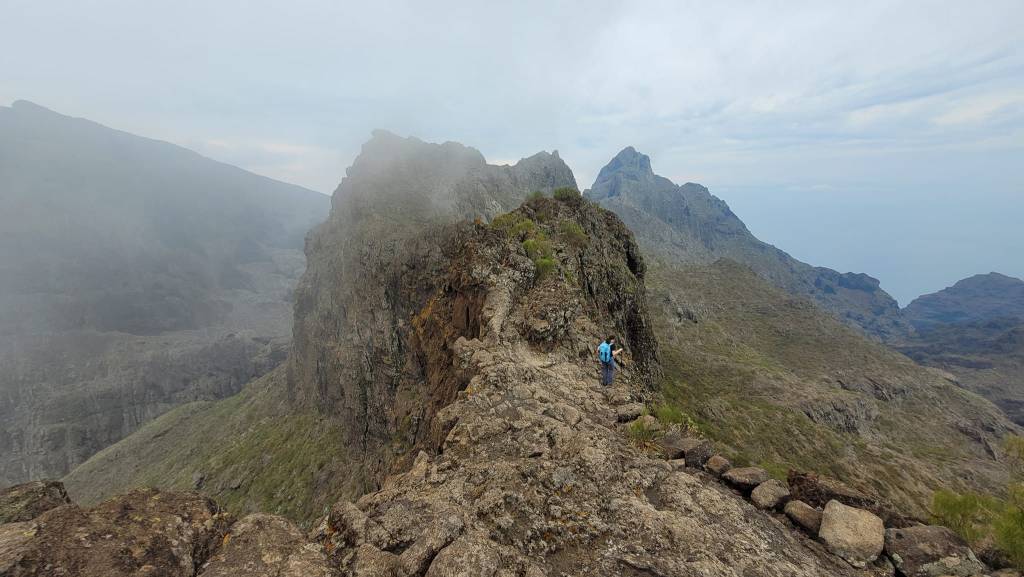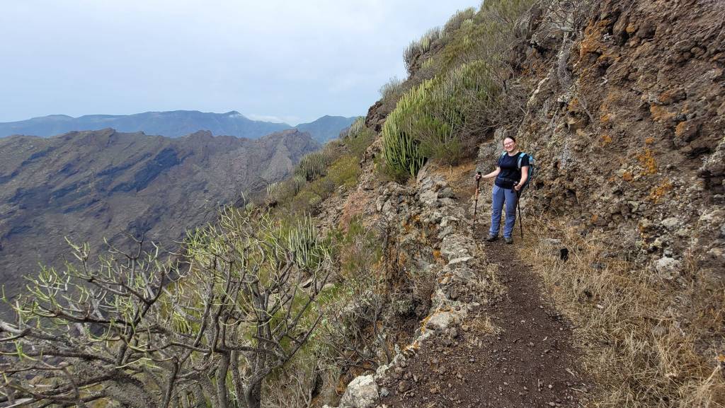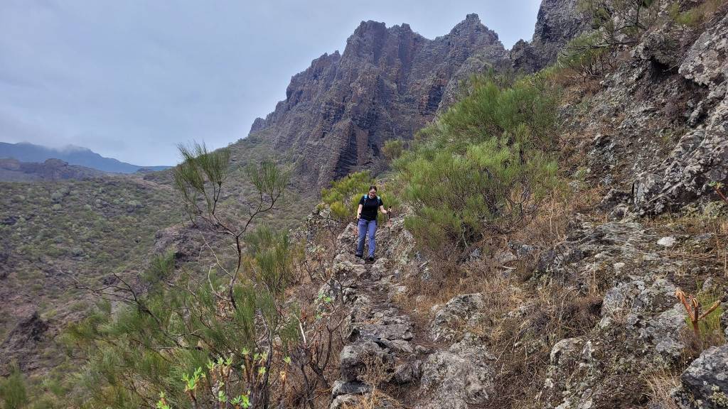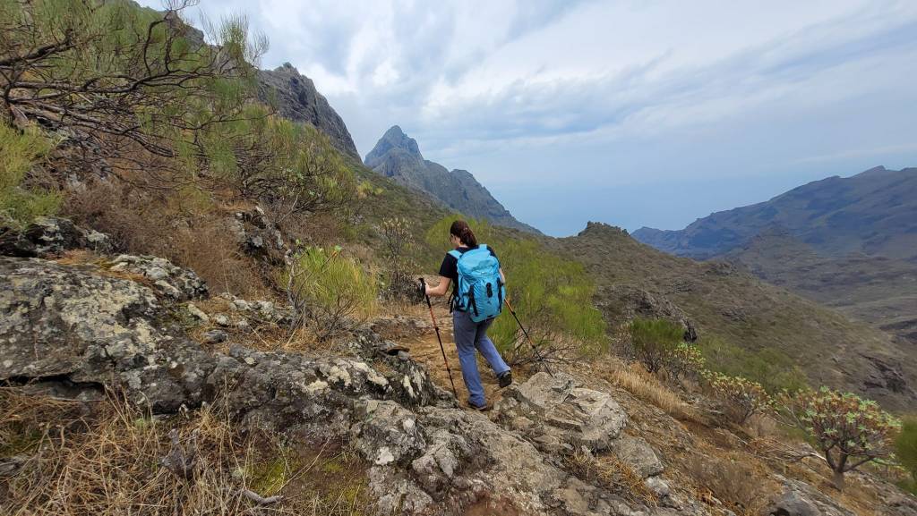 Prvi dan je bil najin cilj, da se od znane vasice Masca spustiva po poti do plaže pod njo. Vendar je pot zaprta. Našla sva obvoz, vendar naju je lokalni ranger spodil nazaj. Zato sva šla na drug trail: in sicer iz miradorja (razgledišča) Cruz de Hilda čez greben gore Pico Yeje. Pot je zelo slikovita in samotna. Najprej poteka po ozkem grebenu, nato pa se ošiljenim hribom izogne po desni strani. Žal pa se kar naenkrat zaključi 300 višincev nad zalivom Masca. Ker so povsod okoli klifi in strme stene ni druge možnosti kot povratek (nazaj navzgor) po isti poti.