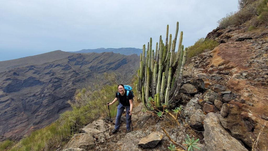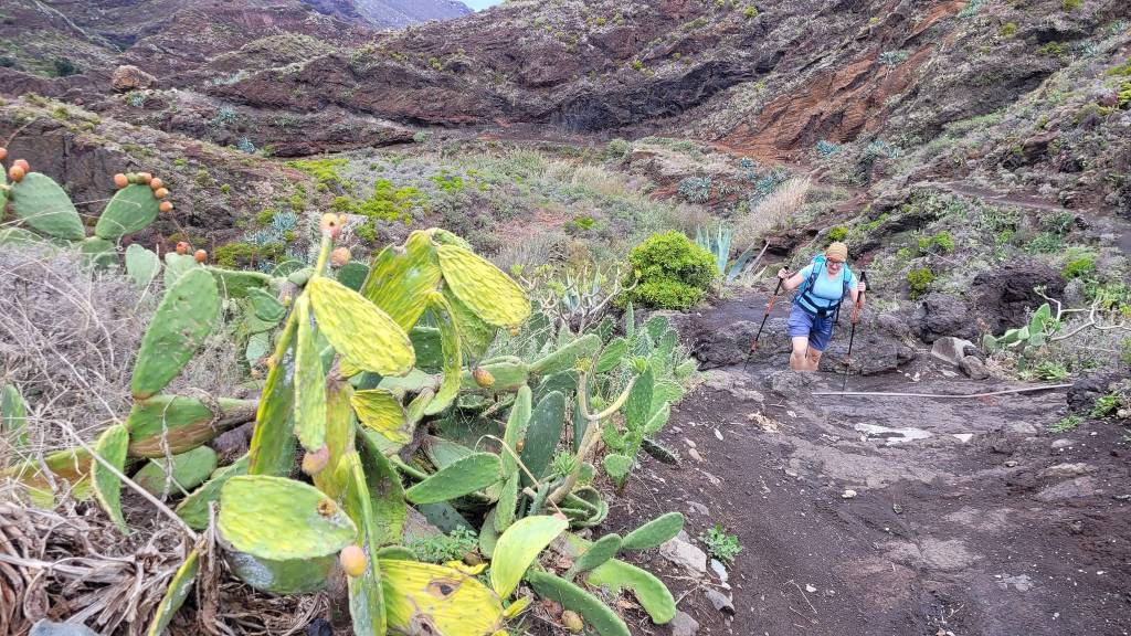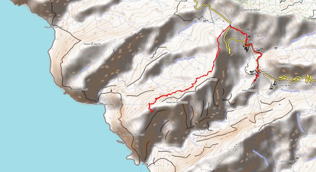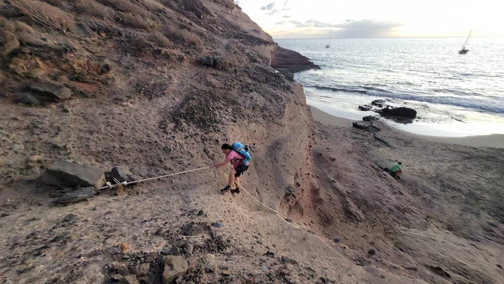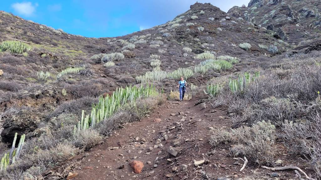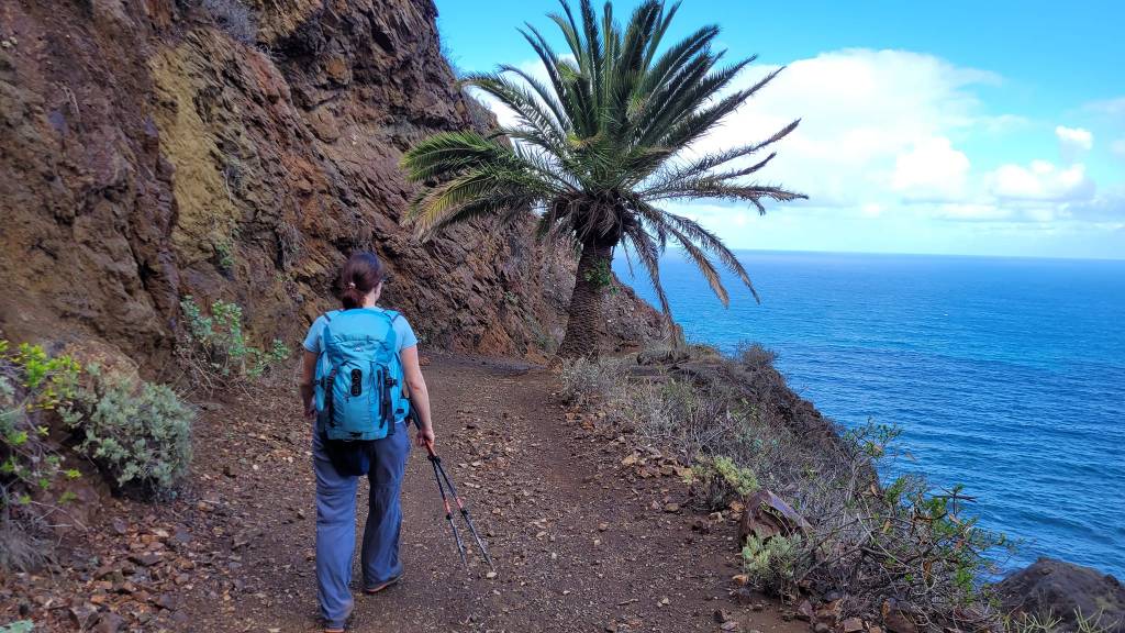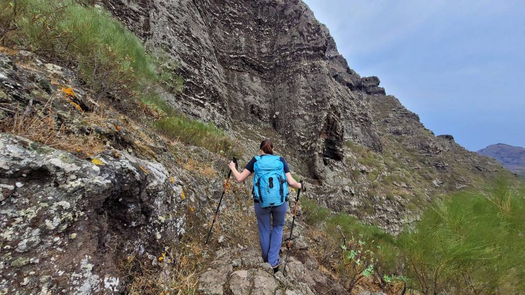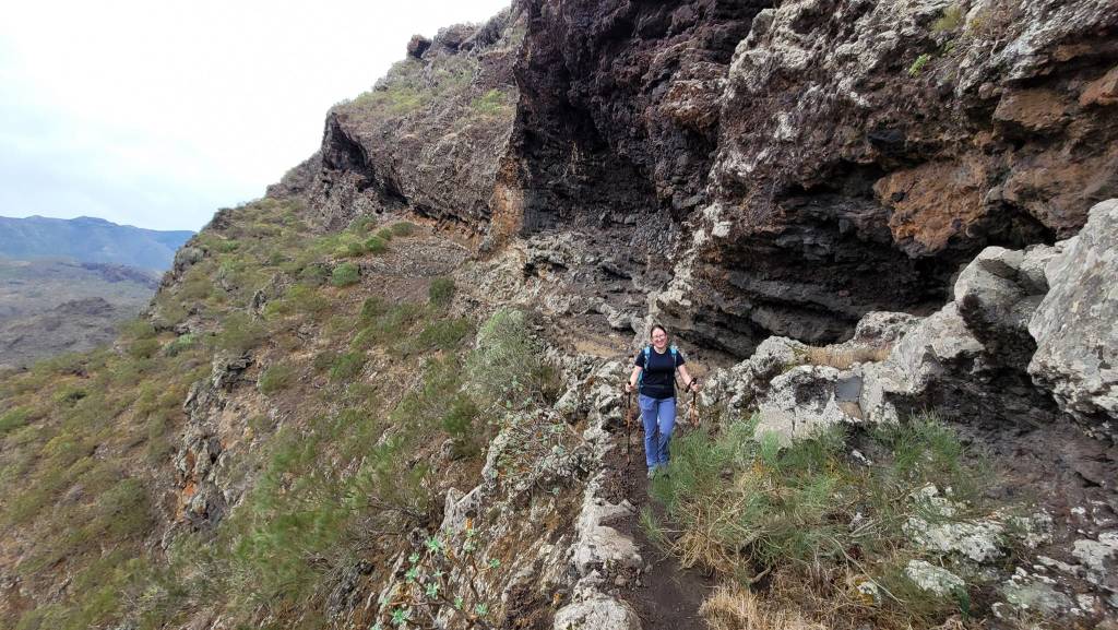 Prvi dan je bil najin cilj, da se od znane vasice Masca spustiva po poti do plaže pod njo. Vendar je pot zaprta. Našla sva obvoz, vendar naju je lokalni ranger spodil nazaj. Zato sva šla na drug trail: in sicer iz miradorja (razgledišča) Cruz de Hilda čez greben gore Pico Yeje. Pot je zelo slikovita in samotna. Najprej poteka po ozkem grebenu, nato pa se ošiljenim hribom izogne po desni strani. Žal pa se kar naenkrat zaključi 300 višincev nad zalivom Masca. Ker so povsod okoli klifi in strme stene ni druge možnosti kot povratek (nazaj navzgor) po isti poti.