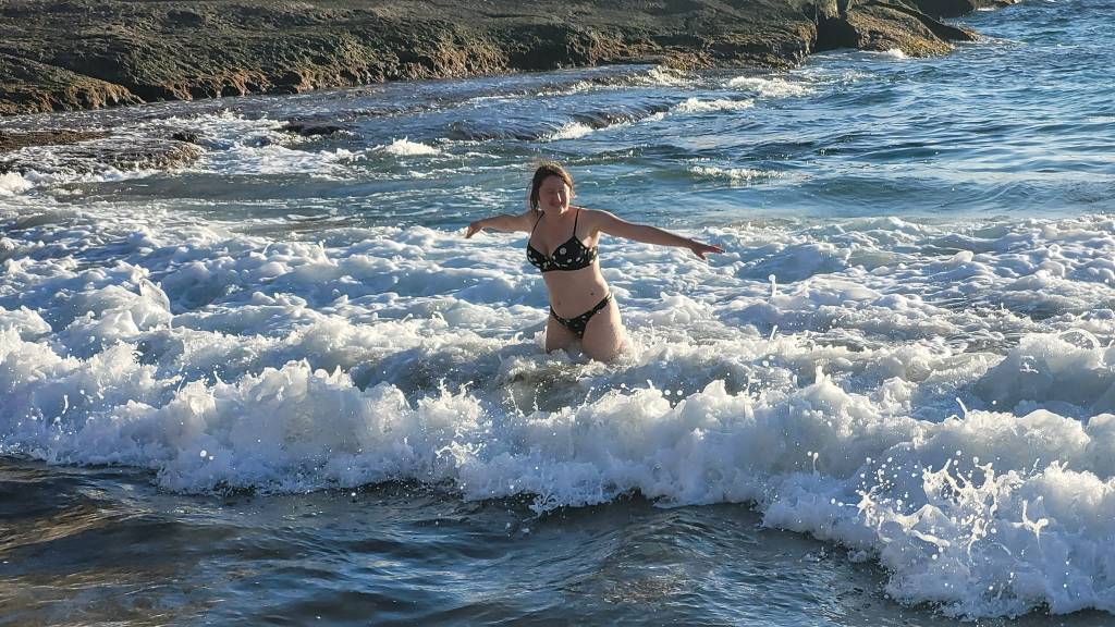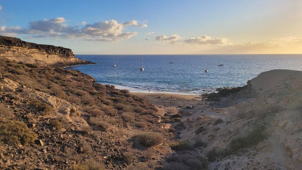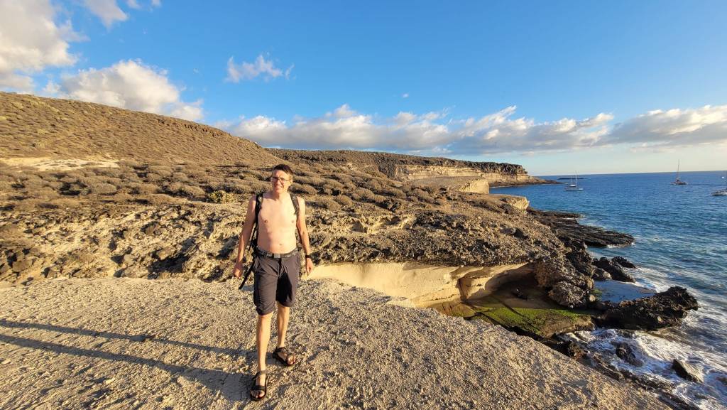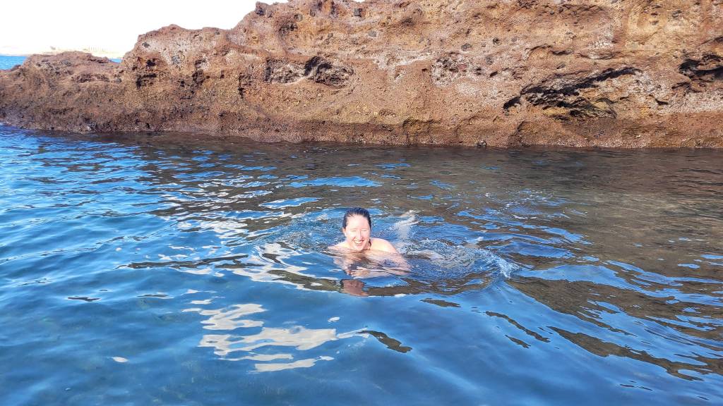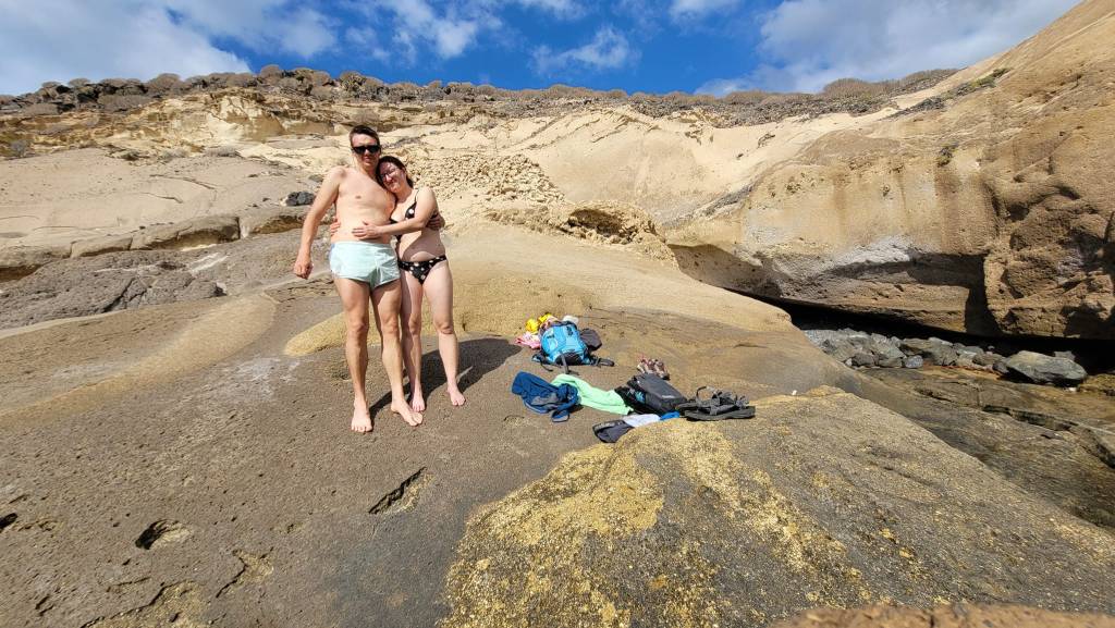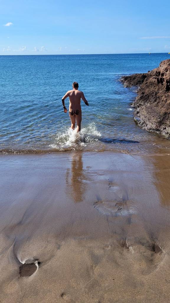 Ves čas dopusta sva veliko hodila po hribih. Sva si pa vsak dan privoščila tudi osvežilno kopanje v Atlantiku. Zaradi vetra in visokih valov je kopanje lahko nevarno, izjema so peščene plaže. Ker imava rada mir, sva se kopala izključno na nudističnih plažah. Le teh je na Tenerifu 14. Njihov seznam najdete na tej povezavi. Midva sva uspela obiskat playe: Las Gaviotas, de la Rajita, Pelada, de los Morteros, Diego Hernandez, Patos in Tejita. Poleg “uradnih 14” je še nešteto odročnih plaž (predvsem v Anagi), kjer se je mogoče kopati gol (npr. midva sva obiskala Playo de Roque Bermejo). Vsaka plaža ima svoj čar; najbolj pa naju je navdušila Rajita, ker je ločena na več manjših skritih plažic pod čudovitim klifi.