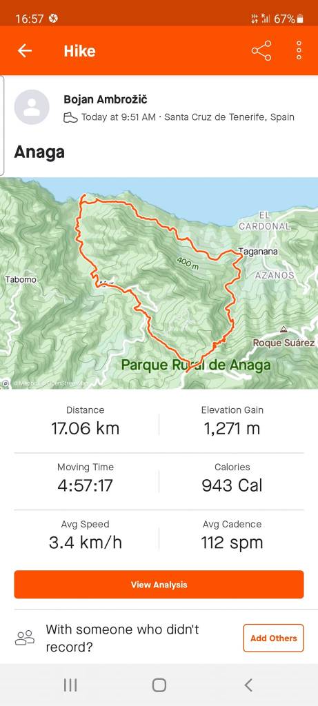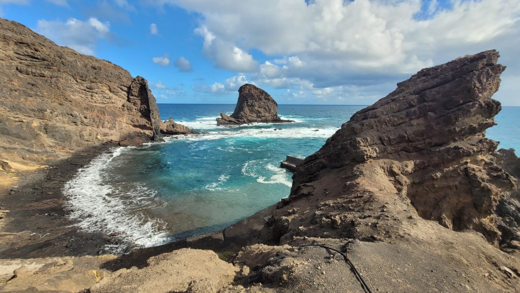 Tretji dan sva se odpravila na SZ otoka, v pokrajino Anago, ki je znana po svojem tropskem deževnem gozdu. Spet sva turo začela na vrhu gore in nadaljevala mimo vasi Tagnana po slikoviti poti nad klifi do plaže Playa del Tamadite. Zaradi visokih valov sva se v morju samo previdno zmočila. Vsekakor nama je ohladitev zelo prijala, saj naju je za tem čakalo še 800 višincev vzpona skozi kanjon potoka Barranco de Afur nazaj do izhodišča.