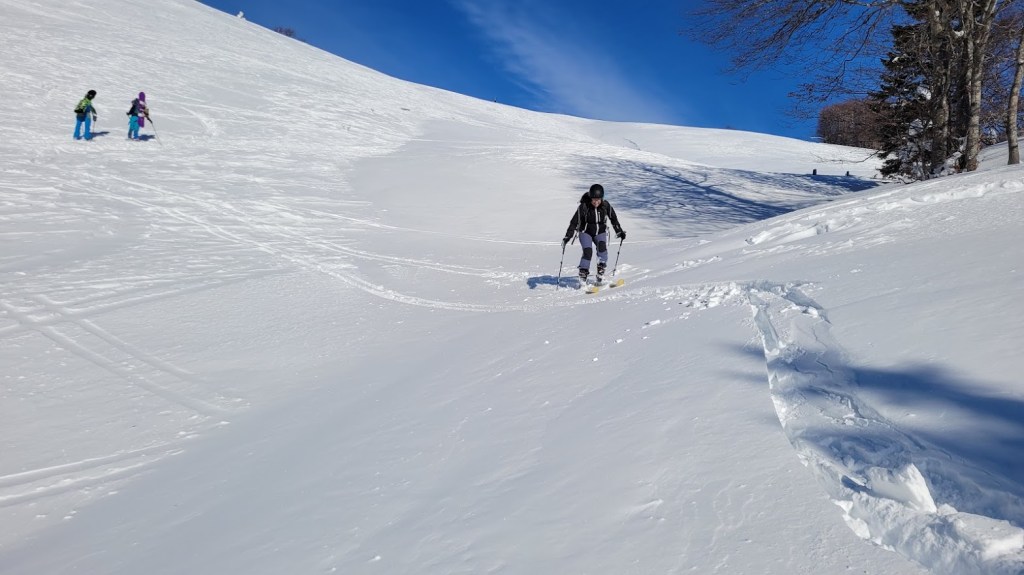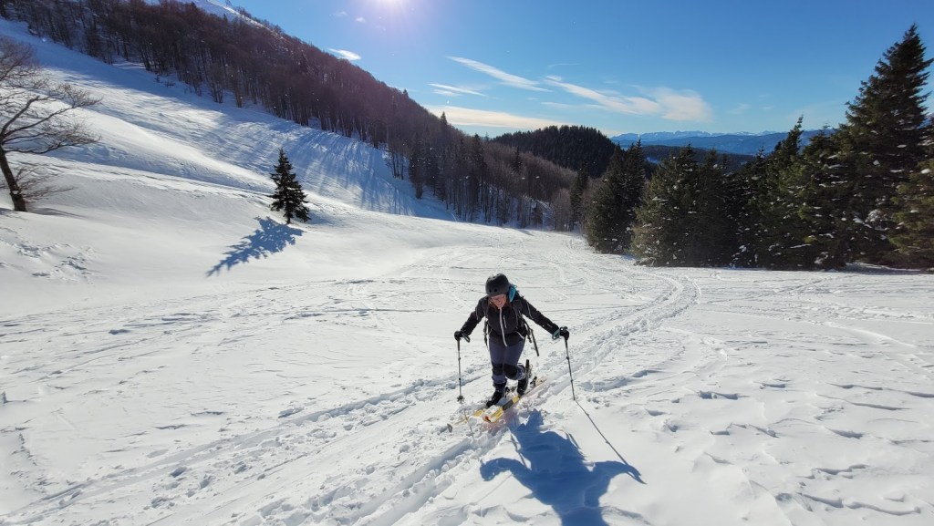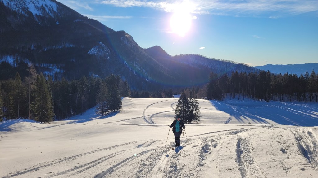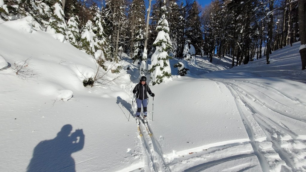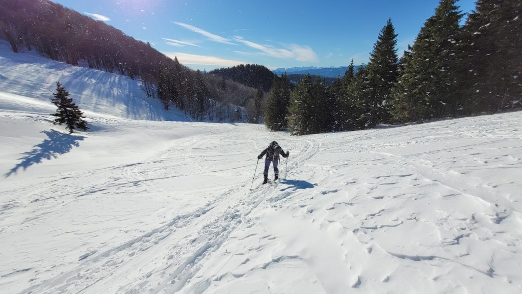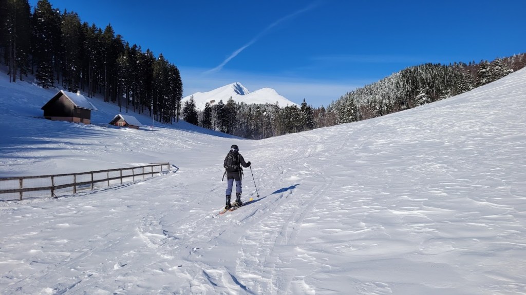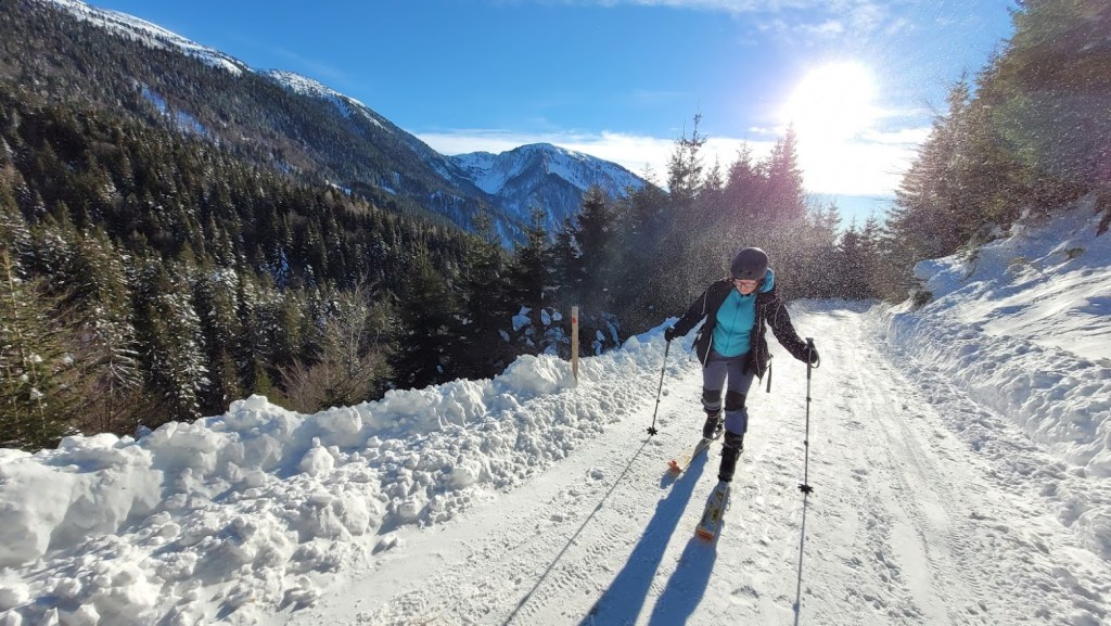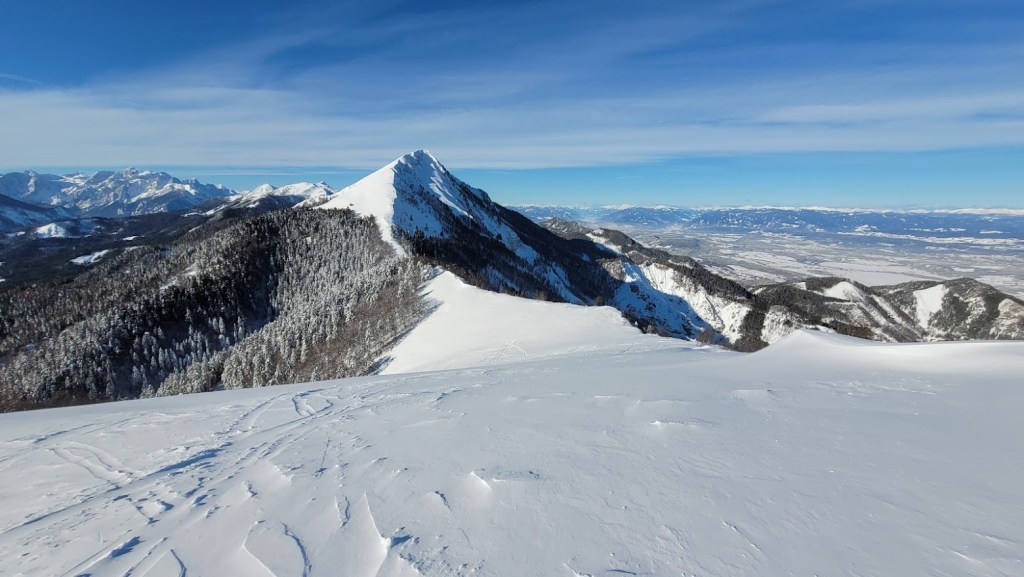 Ptičji vrh (1550 m) je manjši vrh v grebenu Karavank med Golico in Struško. Zaradi majhne naklonine in lahkega dostopa (večinoma se hodi po zasneženi cesti) je zelo primerna tura za začetnike turne smučarje. Vrh pa obiskujejo tudi bolj izkušeni smučarji zaradi bližine smučarsko bolj zanimive Korenščice in pa relativne varnosti pred snežnimi plazovi. Na vrh se je mogoče povzpeti s Planine pod Golico po sankaški progi čez Savske jame. Midva s Petro pa sva šla od Doma Pristava, kjer je še nekoliko manj strmo za smučat. Žal je cesta do Križovcev splužena. Na cesti je ostalo le še dobrih 10 cm snega, kar še mogoče relativno udobno vožnjo s smučmi. Že sedaj pa na nekaterih mestih ven gledajo manjši kamni; takoj ob prvi otoplitvi pa cesta ne bo več smučljiva. Od Križevcev do Pustega rovta cesta ni zorana in je zato normalno smučljiva. Sicer pa je sončen dan, močno začinil mrzel severni veter. To se je poznalo tudi na smučanju. Na vršni flanki Ptičjega vrha je pršič odneslo, namesto njega pa prevladujeta napihanček in mehka kloža. V gozdu pod Pustim rovtom pa je vendarle nekaj pršiča še ostalo.