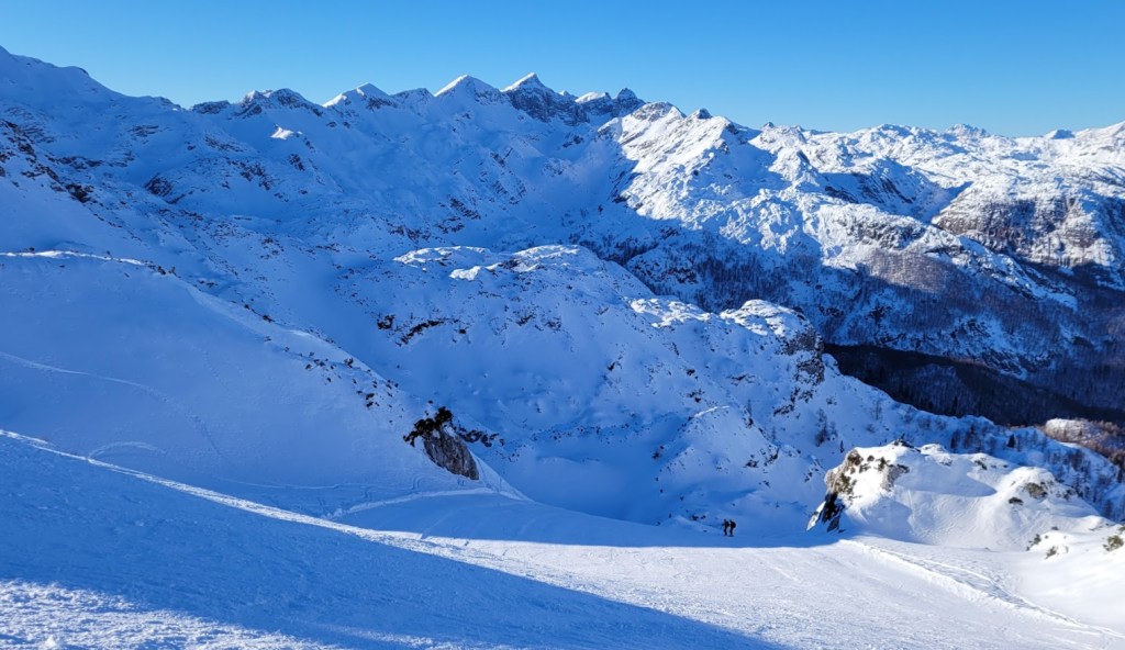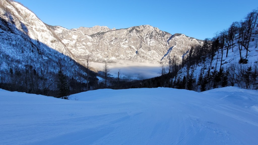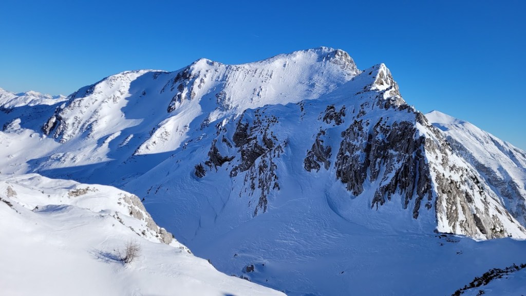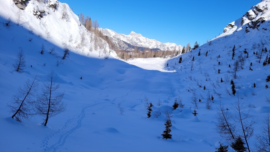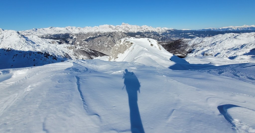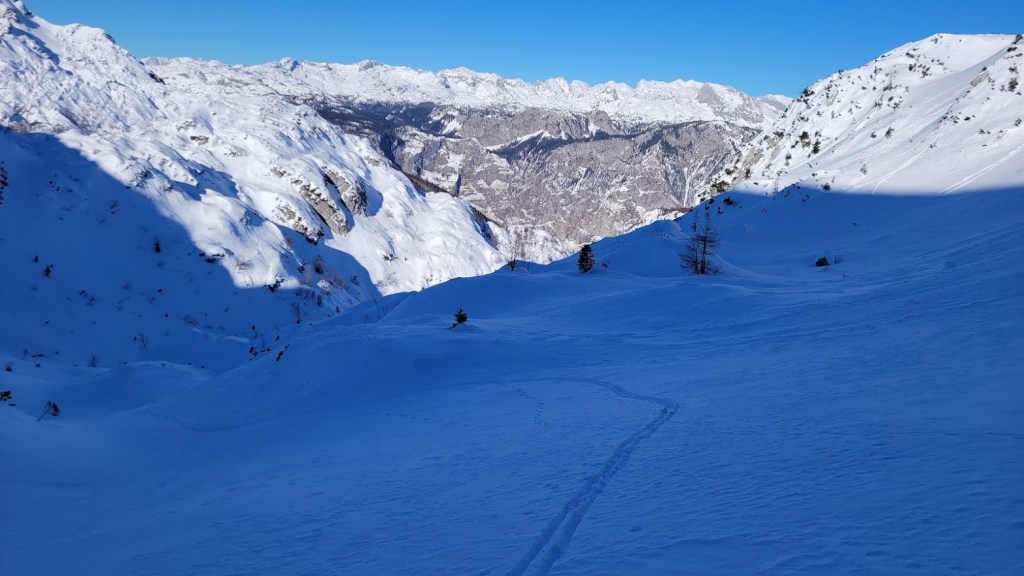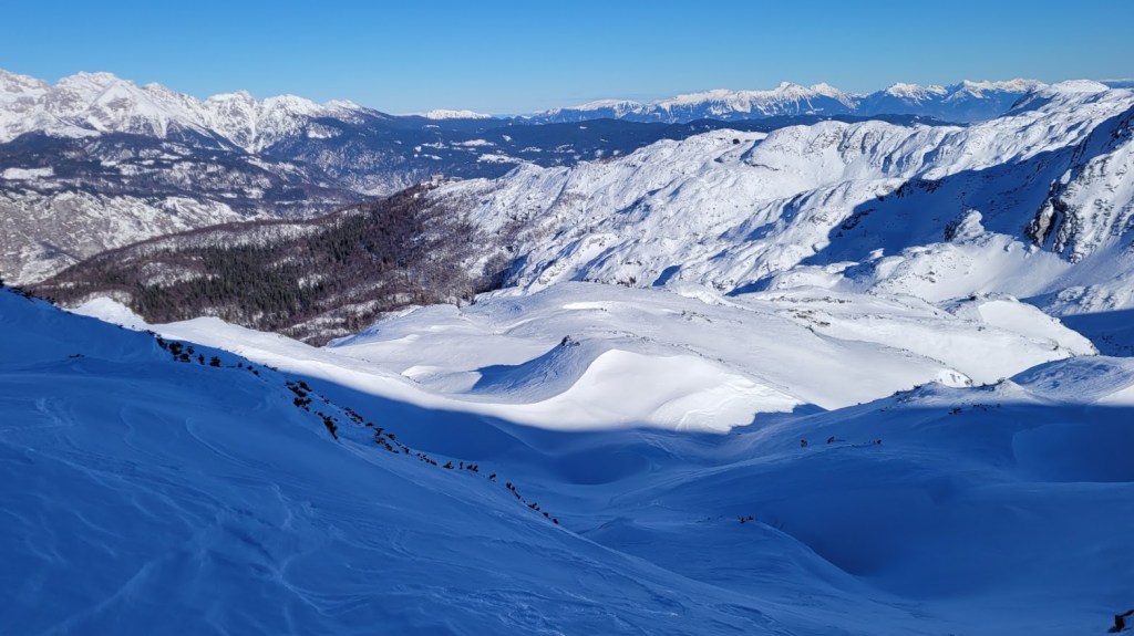 Zaradi odjuge preteklega tedna smo se najbrž vsi spraševali kje iskati dobre razmere za turno smuko. Odločil sem se za Vogel. In ker sem bil pozen (9:30) sem dobil predzadnje uradno parkirno mesto v Ukancu. Nazaj grede sem sicer ugotovil, da so danes občinski redarji zamižali na obe očesi, saj so bili avtomobili parkirani povsod ob glavni cesti. Občinska računica (hočem reči naravovarstvena) je bila očitno danes drugačna. Žagarjev graben je bil danes zratrakiran (zjutraj so bila še reberca). Na planini Zadnji Vogel sem zavil desno proti Voglu. Od tu naprej sem hodil sam, pred mano pa ni bilo niti gazi. Po trasi markirane poti sem se prek Vratc (1668 m) povzpel do Kote 1794 m, ki leži tik pod vršno zgradbo Vogla (1923 m). Naprej pa nisem upal, saj je bila pod Voglom strma prečnica, ki bi bila lahko nevarna za kak kložast plaz. Kasneje sem sicer ugotovil, da se na Vogel pozimi ne hodi po trasi letne markirana poti, ampak da bi moral že spodaj zaviti desno, da bi prišel na greben pri Vrhu Krnic. Odsmučal sem po isti poti nazaj do Zadnjega Vogla (večinoma skorja, ampak sploh ne tako slaba smuka). Nazadnje pa sem se za trening po smučišču vzpel še na Šijo. Skupaj se je nabralo 1850 višincev in 22 km.