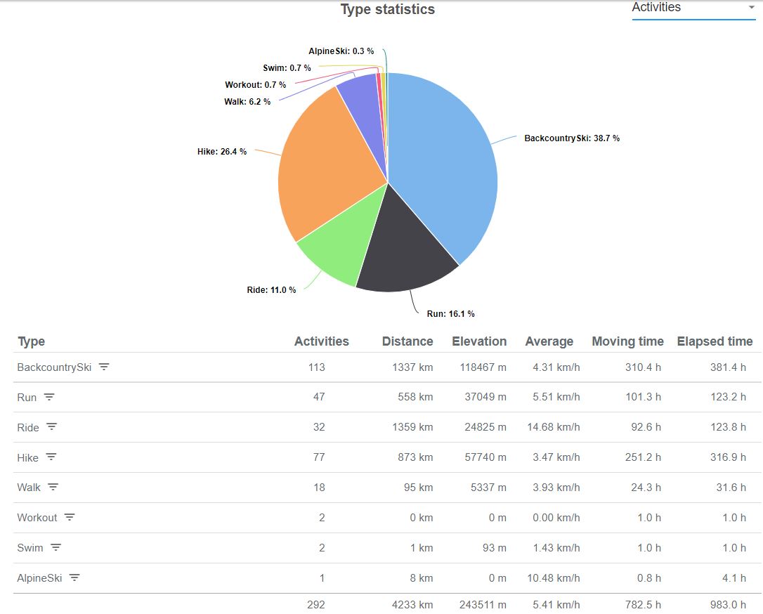 Leto 2021 si bom zapomnil po tem, da sem zelo veliko časa preživel v hribih. Od tega sem največ časa turno smučal: in sicer 110-krat. Brez smuči (gorništvo) sem šel v hribe 77-krat. Poleg tega sem v hribe tekel 28-krat. S kolesom sem bil v hribih 11-krat. Torej to znese 222 dni hribov. Z vsemi aktivnostmi sem v letu 2021 skupno premagal 243.500 m višinske razlike, kar znese povprečno 667 višinskih metrov na dan. Na drugi strani še nobeno leto nisem tako zelo malo tekel: v celotnem letu sem tekel samo 47-krat in pri tem premagal 557 km, kar je manj kot sem pred leti pretekel vsak mesec. Prekolesaril sem 1350 km, veliko večino v poletnih mesecih, ker me pogosto zebe in je kolo rezervirano res samo za najtoplejše dni v letu. Športno aktiven sem bil 267 od 365 dni v letu 2021, kar mi je vzelo 983 ur časa, kar je 41 dni. Vsi podatki so vzeti iz Strave in spletne strani: Statshunters.com.