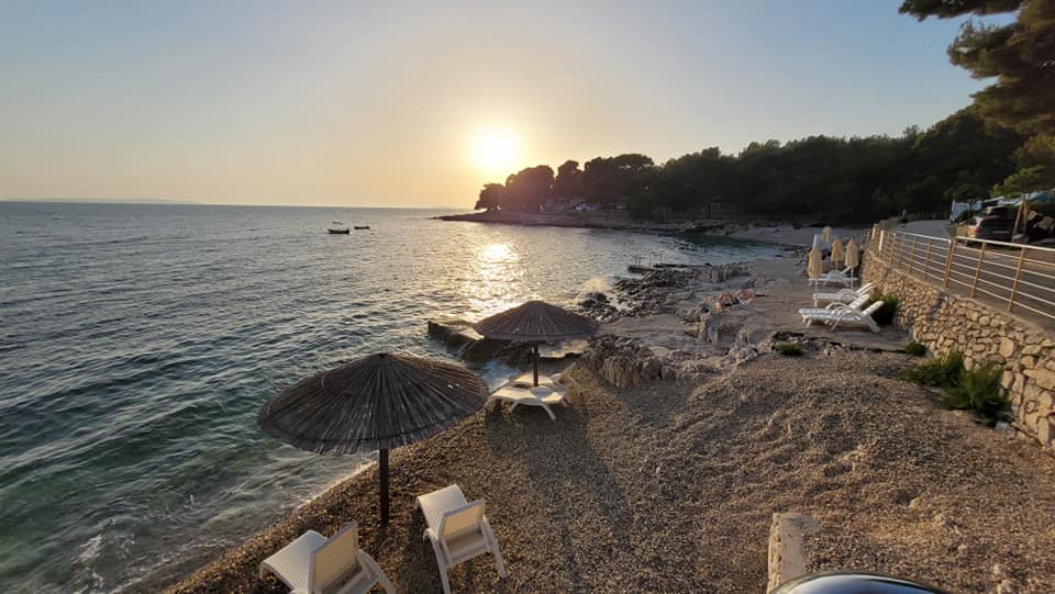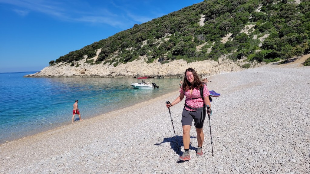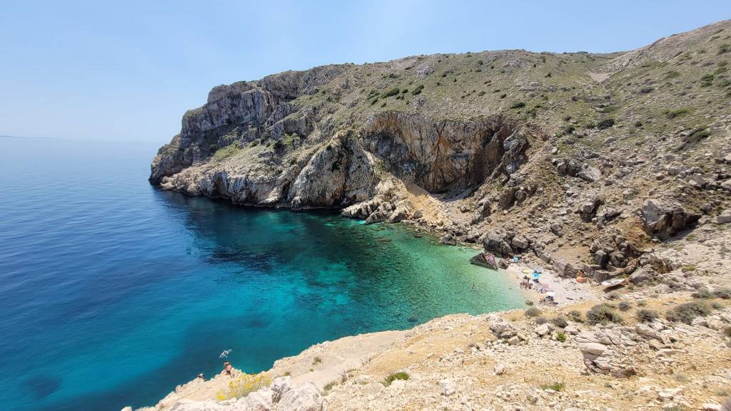 Obala otokov je večinoma skalnata. Pravih plaž je razmeroma malo. Najbolj znani sta plaži Lubenice in Plava Grota. Obiskala sva slednjo, ki je znana po morski jami v katero se lahko zaplava. Peščene plaže so samo na skrajnem jugu Cresa v relativni bližini nudističnega kampa Baldarin. Najbolj všeč nama je bila plaža Meli, ki je pravi mali raj. Ker pa je očitno plaža precej znana, je hipoma postala polna. Ker sva si zaželela miru, sva kar gola in v natikačih šla naravnost čez gozd proti sosednjim zalivčkom. Na zemljevidu je to pičlih 200 m zračne črte. V praksi pa je vmes goščava, trnje, ki trga oblačila, kaj šele golo kožo. Kot dva robinzona sva se po pol ure iskanja prehodov vsa krvava uspela nekako prebiti do omenjene plaže. Kopalci na plaži (ki so sem prišli s čolni po morju) so naju samo začudeno gledali, ko sva naga in krvava prilezla iz grmovja. Ker drugega izhod iz plaže ni bilo, nama ni preostalo drugega, kot da sva krvavi pot skozi trnje ponovila do prvega kolovoza, ki naju je pripeljal nazaj do avta.
