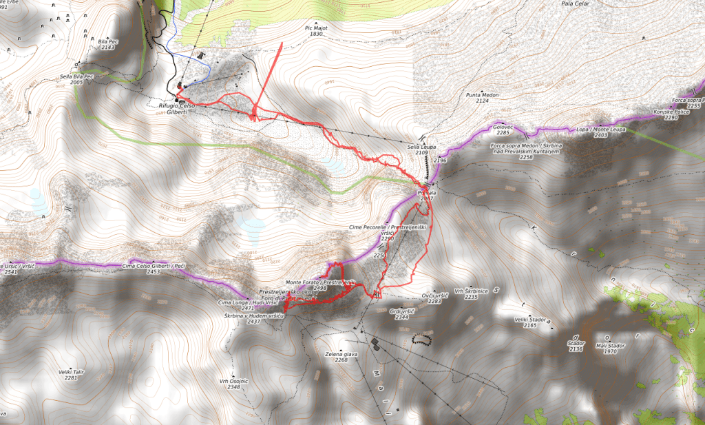 Načrtovan izlet v Zahodne Julijce sva začela nekoliko čudno: najprej sva se z Rablja odpravila proti Kraljevi Špici. Vendar sva se po dobre pol ure hoje zaradi klopov premislila in se odpeljala v Sello Neveo. Tam sva se vkrcala na gondolo do koče Gilberti, ki še vedno stane samo 10 € (povratna karta), kar je ceneje kot marsikje pri nas zgolj parkiranje. Nato sva se po smučarski progi vzpela mimo vrha Kaninskega smučišča do Prestreljeniškega okna. Tu se začne ferata, ki je ves čas lahka (A), z izjemo enega malo bolj izpostavljenega mesta s skobami, kjer za hip doseže oceno B. Zato je ta ferata primerna za vsakogar. Ferata preči južno stran Prestreljenika. Od njenega konca do vrha gore pa je še 20 min peš. Sestop poteka po običajni (lahki) planinski poti.