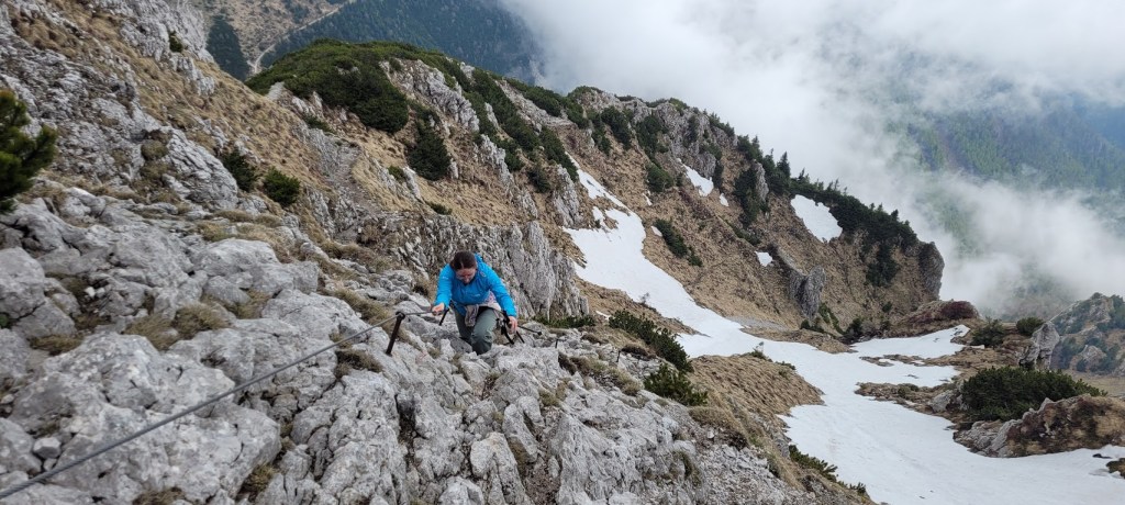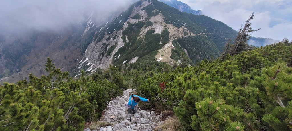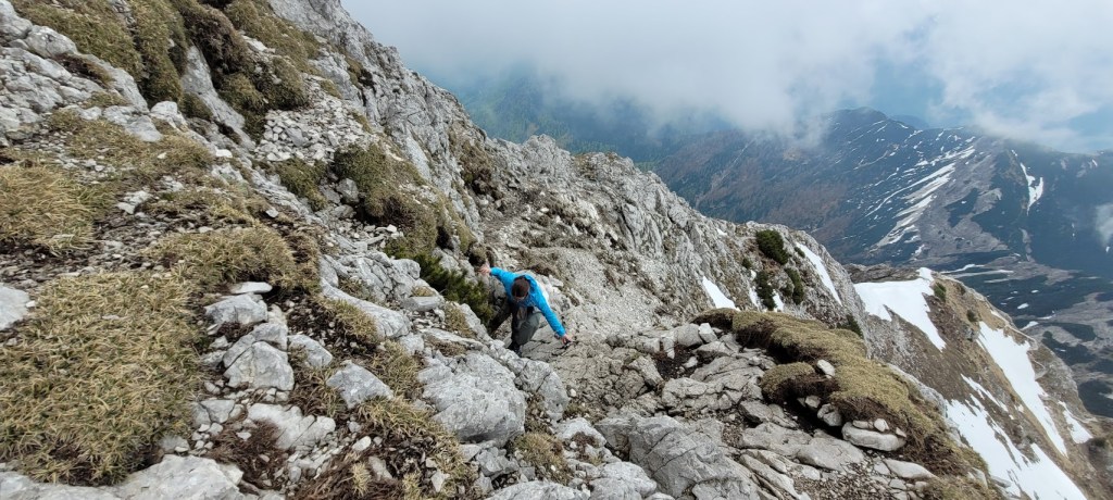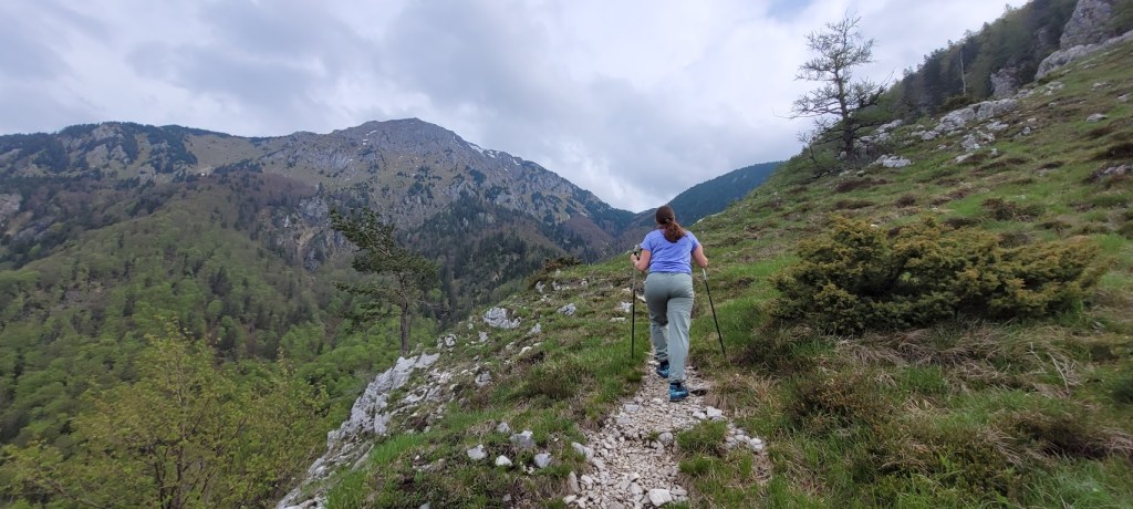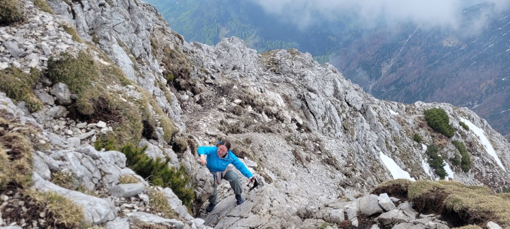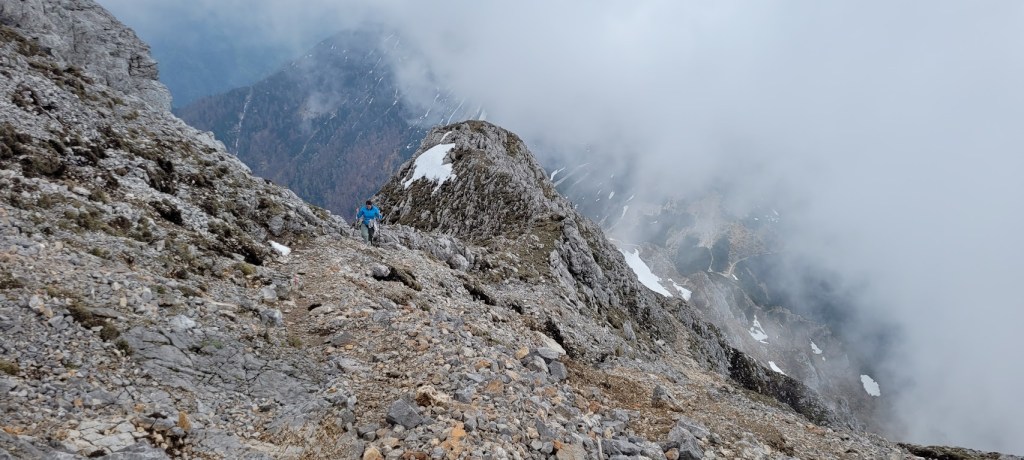 Po en mesecu izjemno slabega in deževnega vremena končno vikend s (skoraj!) lepim vremenom. V soboto sva šla z Laškega na Storžič prek Kališča. Pot po grebenu z Bašeljskega sedla je kopna. Za Petro je bil to na sploh prvi vzpon na vrh Storžiča, čeprav ga gleda skozi okno domače hiše že celo življenje. Sestopila sva po grabnu proti planini Javornik. Tod pa je še precej snega. Na srečo je bil sneg dovolj južen, da sva v snežišča lahko vbijala stopinje. Nižje pa je veliko blata in kamenja, ki so ga pozimi nanesli snežni plazovi.