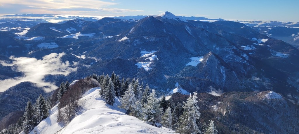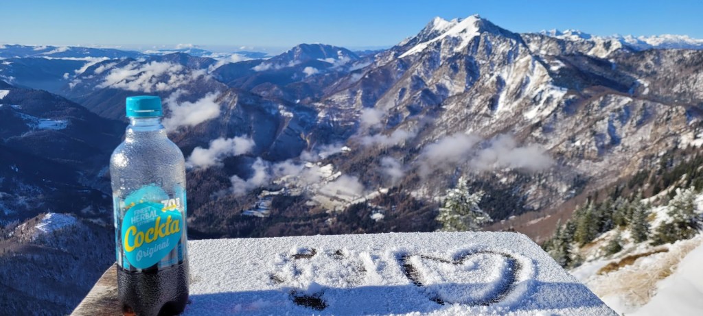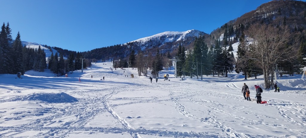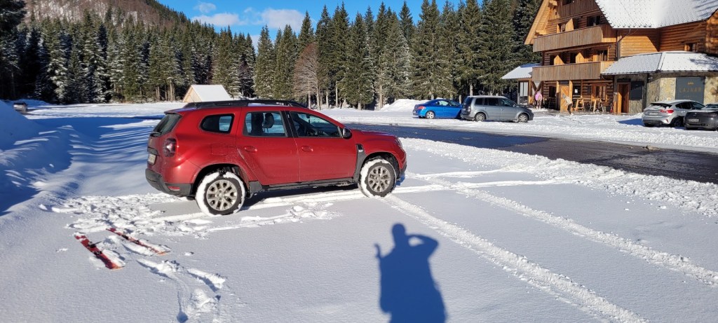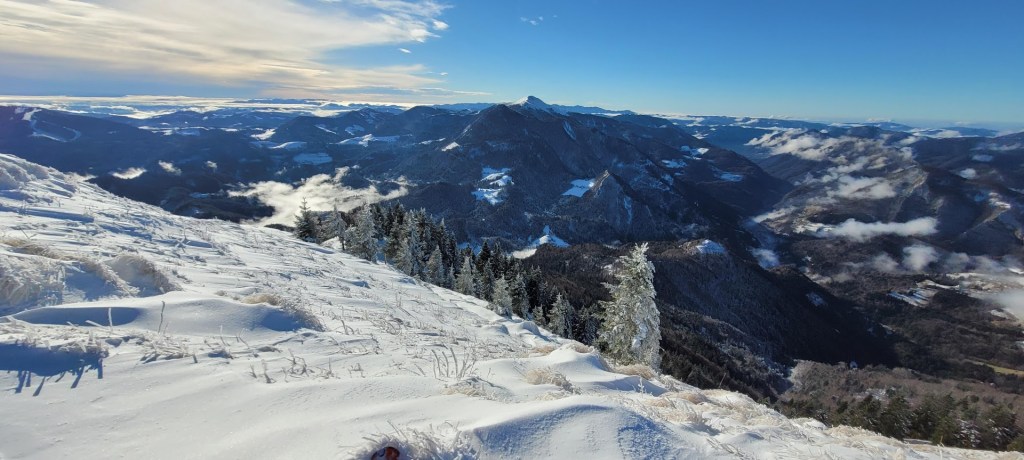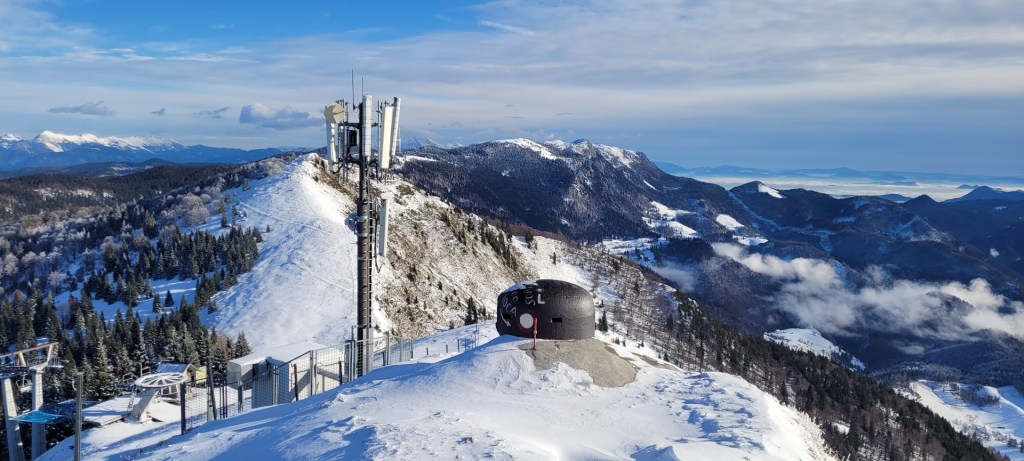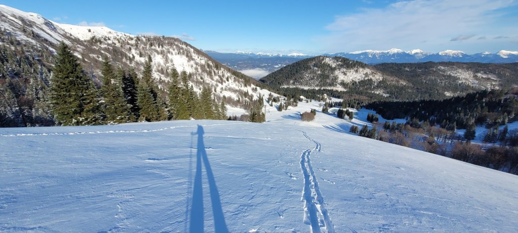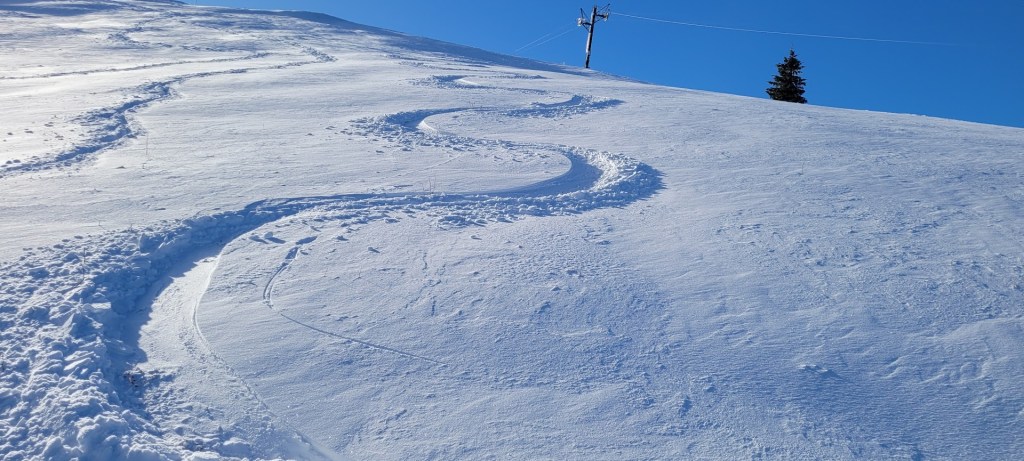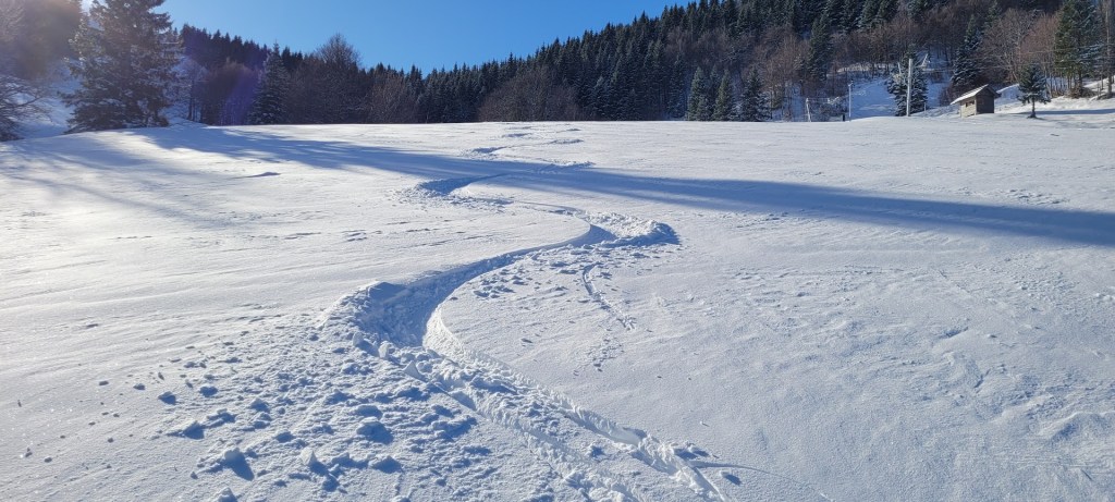 Po nočnem rahlem sneženju sem prvi potegnil špuro na Lajnar na Soriški planini. Novega snega je samo 10 cm. Zato je bilo potrebno zelo paziti nazaj grede. Vršni grebenček sem presmučal po opasti, potem pa sem zavil levo proti sedlu pod Lajnarjem, kjer sem vedel, da je podlaga borovničevje brez kamenja. Tistih nekaj zavojev je bilo super.