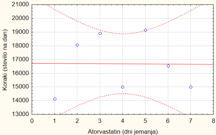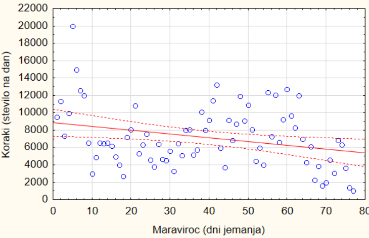 Atorvastatin sem jemal skupaj Maravircom. Vendar sem ga 7 dni jemal preden sem začel jemati Maraviroc in takrat se mi je zdravje nenadoma nenormalno izboljšalo. Zato sem tukaj zrisal korelacijo zgolj za tistih 7 dni, potem ostalo je enako kot pri Maravirocu. Kot sem že zgoraj omenil, pri statističnih analizah ne gre brez subjektivnih odločitev. Statistika izboljšanja ne kaže, ampak če pogledate sem takrat dosegel največjo dnevno število korakov od kar imam razvit dolgi covid (povprečno skoraj 17000, kar je 14 km dnevno).