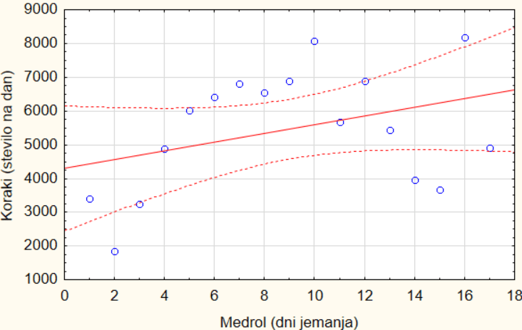 Medrol je kortikosteroid za katerega nekatere raziskave kažejo (povezava do članka), da pomaga pacientom z dolgim covidom. Dobil sem depo medrola v mišico, ki se bo počasi sproščal 3 mesece: zato kljub temu, da sem dobil samo eno dozo, smatram, da gre za več enakomerni dnevnih doz. Zaenkrat je od prejema medrola minilo 17 dni. Zaenkrat je prisotna zelo šibka pozitivna korelacija. Ker je zdravljenje šele s tem zdravilom šele v prvi fazi, upam da bom čez 3 mesece zrisal bolj vzpodbuden graf.