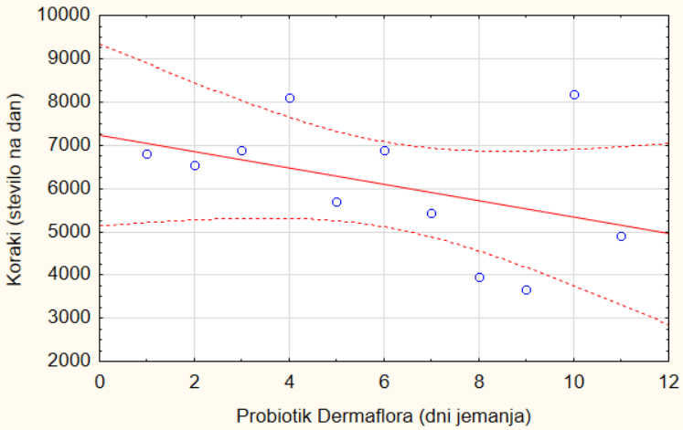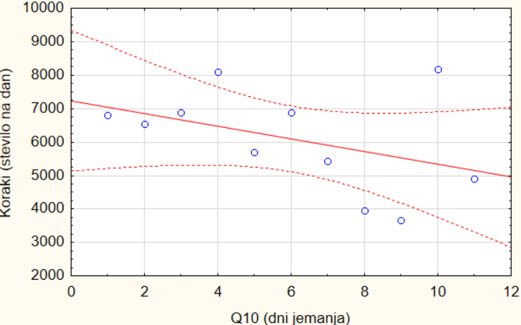 Ta prehranski dodatek jemljem, ker je znano, da nekaterim bolnikom pomaga pri obnovi imunskega sistema, ki je zelo prizadet zaradi dolgega covida. Prisotna je negativna korelacija (r=-0,42), ki ni statistično značilna. Q10 in probiotik jemljem skupaj -zato sta oba grafa identična.
