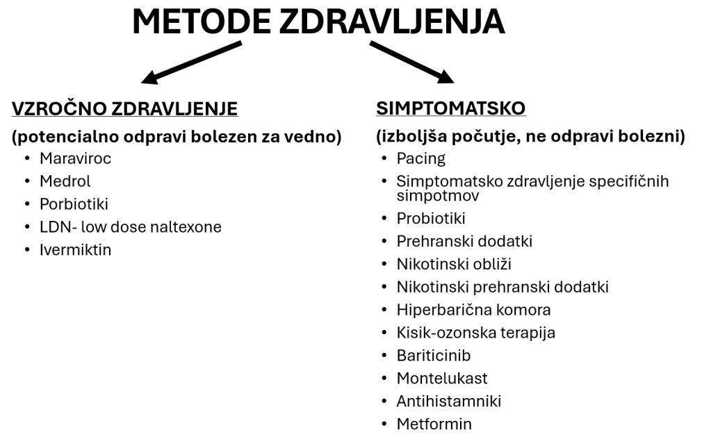 Metode zdravljenja lahko razdelimo na dve skupini: simptomatska zdravljenja in vzročna zdravljenja. Simptomatska zdravljena so tista zdravljenja, ki zdravijo enega ali več simptomov, kot posledica dolgega covida (npr. če imam glavobol in vzamemo analgetik). V nekaterih primerih je simptomatsko zdravljenje nujno, tudi za ohranitev življenja, kot npr. pri srčnih in možganskih kapeh, kot posledica dolgega covida. Prav tako nam bolnikom simptomatska zdravljenja do neke mere izboljšajo kvaliteto življenja. Vendar jaz sem kar malo kritičen do teh metod zdravljenja, ker v resnici ne ozdravijo bolezni, ampak samo blažijo simptome. Kot sem že večkrat pisal, pri dolgem covidu je znano več kot 200 različnih simptomov in še slabše: značilnost te bolezni je, da pogosto, ko pozdravimo en simptom, se pojavi drug, pogosto povsem nepovezan simptom. Vsaka zdravila, ki jih jemljemo zagotovo imajo določene nezaželene stranske učinke.