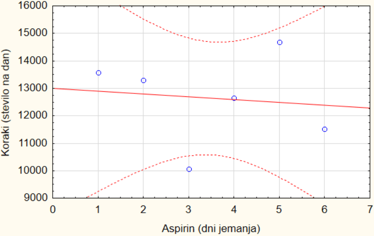 Za vsako zdravilo sem izračunal Pearsonov korelacijski koeficient r; pri stopnji zaupanja p = 0,05 , kar pomeni 95 % stopnjo zaupanja. Koeficient r lahko leži med vrednostmi -1 in +1. Če r = 0; to pomeni, da ni nobene korelacije med koraki- a.k.a. mojim počutjem in zdravilom – torej zdravilo ni imelo vpliva na moje počutje/zmogljivost. Če je r blizu vrednosti 1 pomeni močno korelacijo; torej zdravilo mi je koristilo. Če pa je r blizu vrednosti -1, pa pomeni, da mi je zdravilo škodovalo.
