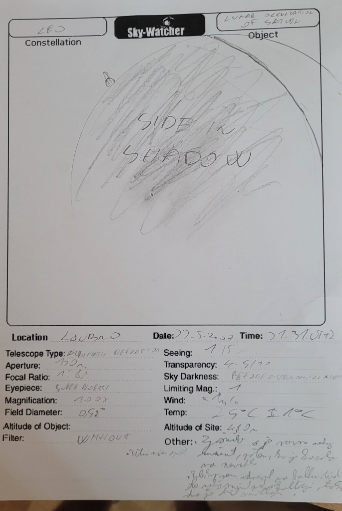 Danes, 21. 8. ob 5:34 zjutraj je Luna okultirala – zakrila Saturn – zgodil se je neke vrste mrk. To bi bil veličasten pogled. Žal sem moral jaz zaradi svoje bolezni takrat spati, da se ne bi preveč utrudil. Sicer sem ta pojav enkrat že uspel opazovati pred 17 leti. Ker takrat nisem imel možnosti fotografiranja, sem skiciral, kar je bilo pred desetletji bolj v navadi kot danes, ko ima vsak vsaj mobitel za slikanje, če ne kaj boljšega. Skiciranje sem nato opusti, ker za risanje res nimam talenta. Vseeno mi je tudi na tak zelo primitiven način ostal lep spomin.