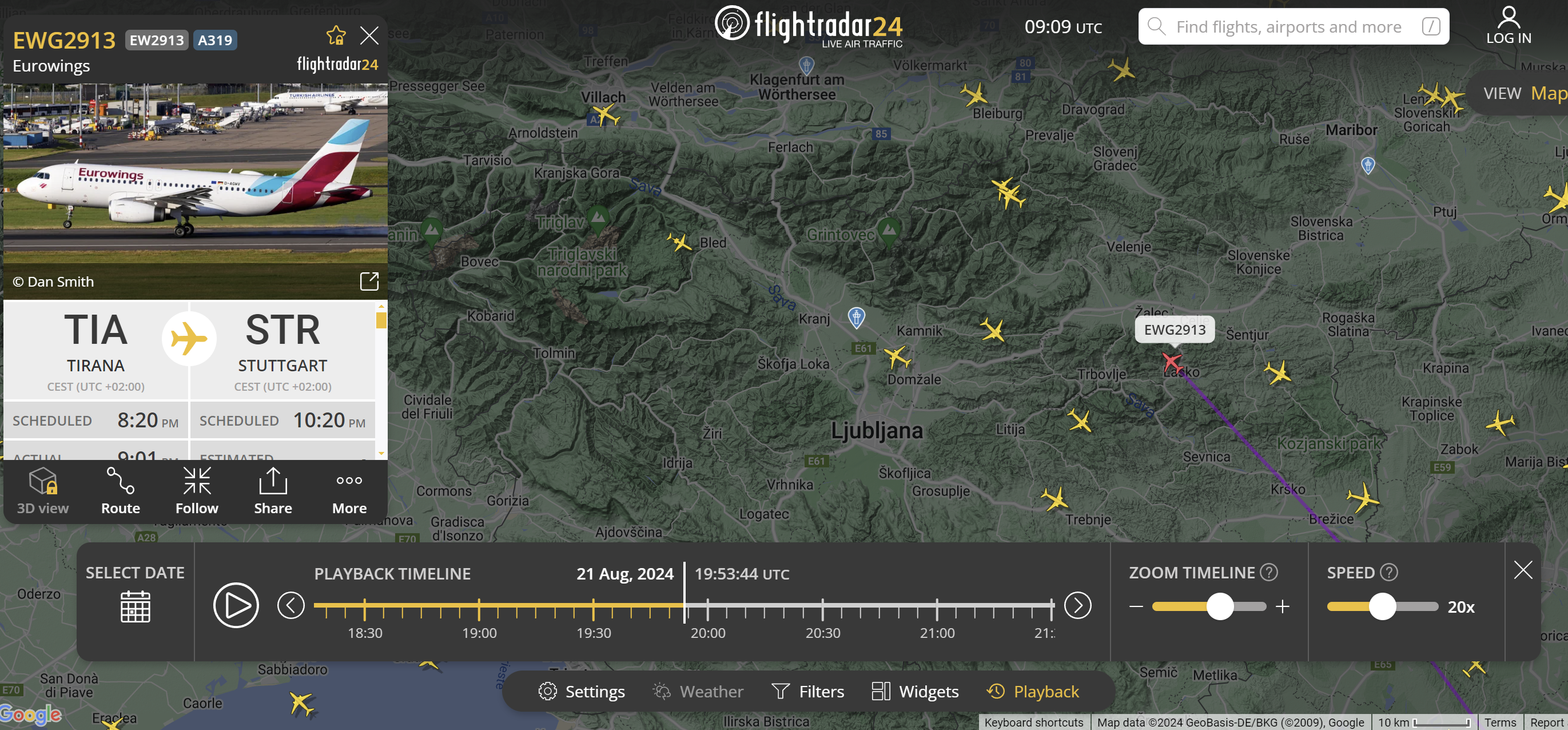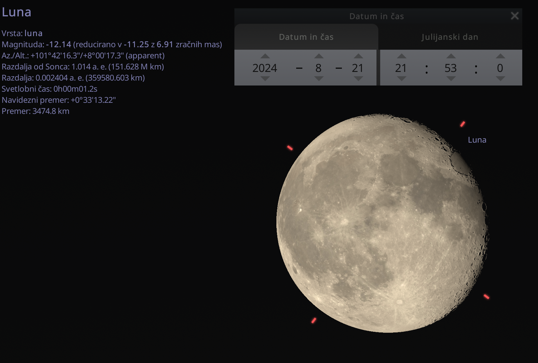 Siing je bil spet slab. Se mi je pa posrečilo fotografirati avijon, ki je letel prek Lune. Lahko bi rekli: “Fly me to the Moon”. S pomočjo aplikacija FlightRadar24 sem ugotovil, da je šlo najverjetneje za letalo Airbus A319 na letu Eurowings EWG2913 Tirana-Stuttgart: https://www.flightradar24.com/2024-08-21/19:53/20x/EWG2913/36be8a4a. To sem ugotovil na sledeč način.
