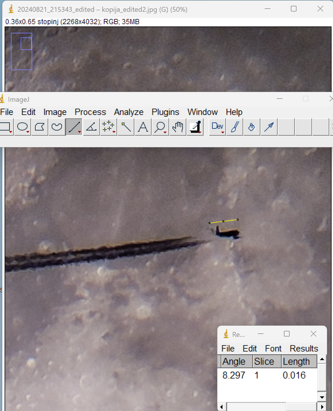 Po podatkih Stellariuma je bila Luna gledano iz mojega opazovališča v momentu prečkanja letala (ob 21:53 uri) na azimutu 101 ° in 8 ° nad obzorjem. Omenjeno letalo je bilo nad Laškim na višini 11570 m in 77 km zračne razdalje od mene. S kotnimi funkcijami (tangens kota) sem izračunal, da to pomeni, da je bilo letalo 8,5 ° nad obzorjem, kar je znotraj napake. Azimut letala v času prečkanja Lune sem določil z Google Earthom na 102 °, kar je tudi znotraj napake. Napaka oz. netočnosti izhaja predvsem v tem, da imam čas prečkanja letala zabeležen zgolj na eno minuto natančno. Če bi imel ta podatek natančen na sekundo bi bilo veliko lažje. Dolžina letala A319 znaša 34 m. Torej bi na izmerjeni razdalji 77 km, morala biti navidezna velikost letala 0,025 stopinje. Jaz pa sem s programom ImageJ izmeril navidezno velikost letala na 0,016 stopinje. Pričakovano sem dobil manjšo vrednost, ker kot je razvidno iz slike, je letalo vidni iz strani in je zato videti krajše, kot je v resnici.