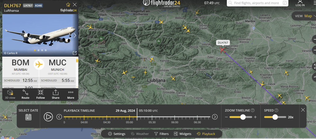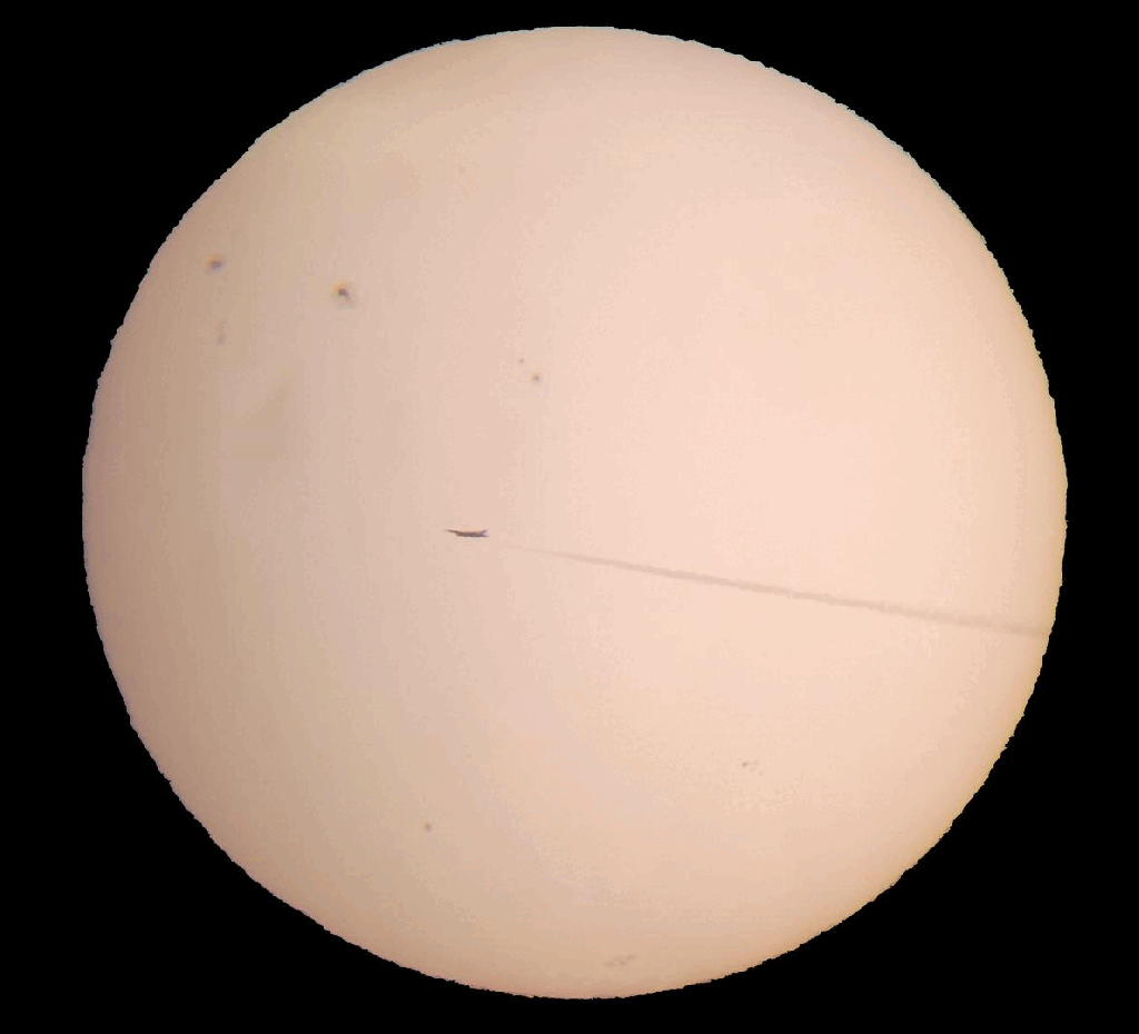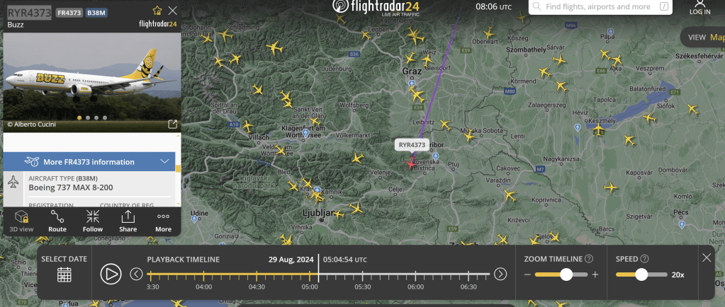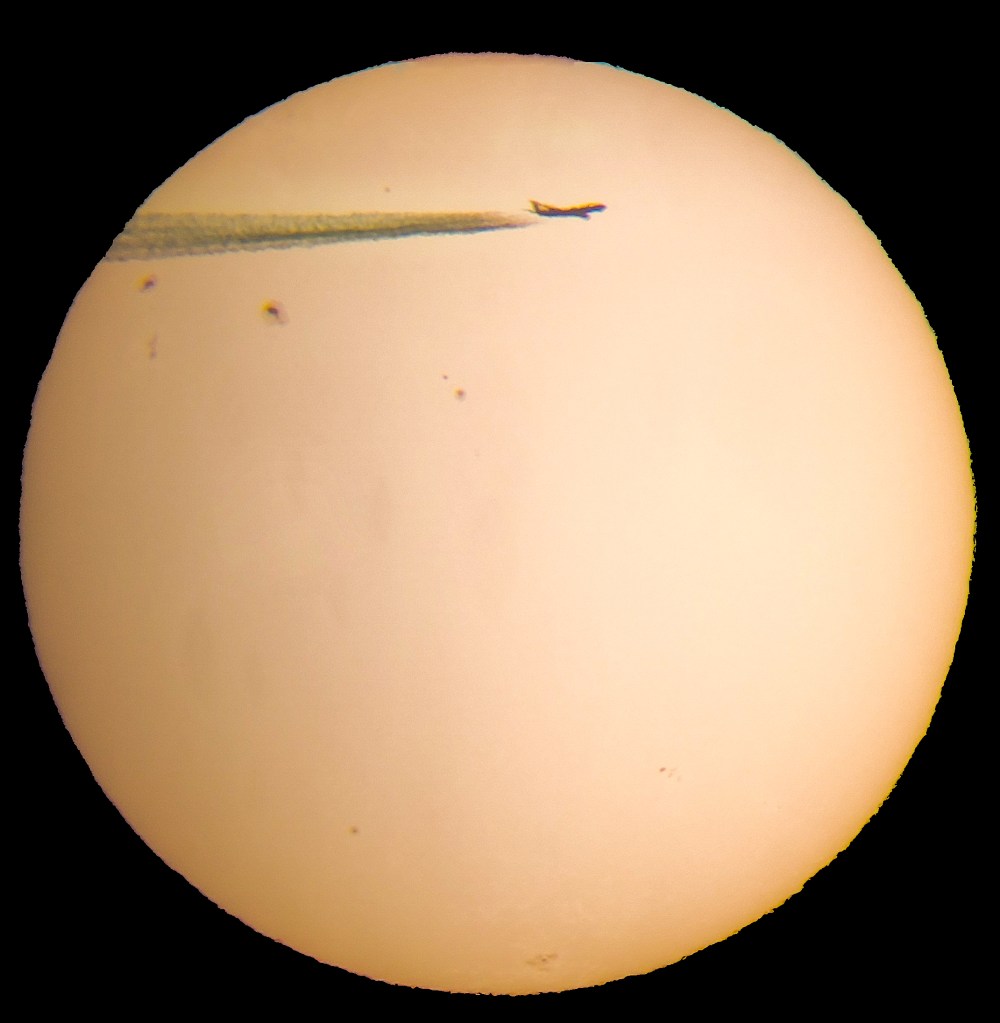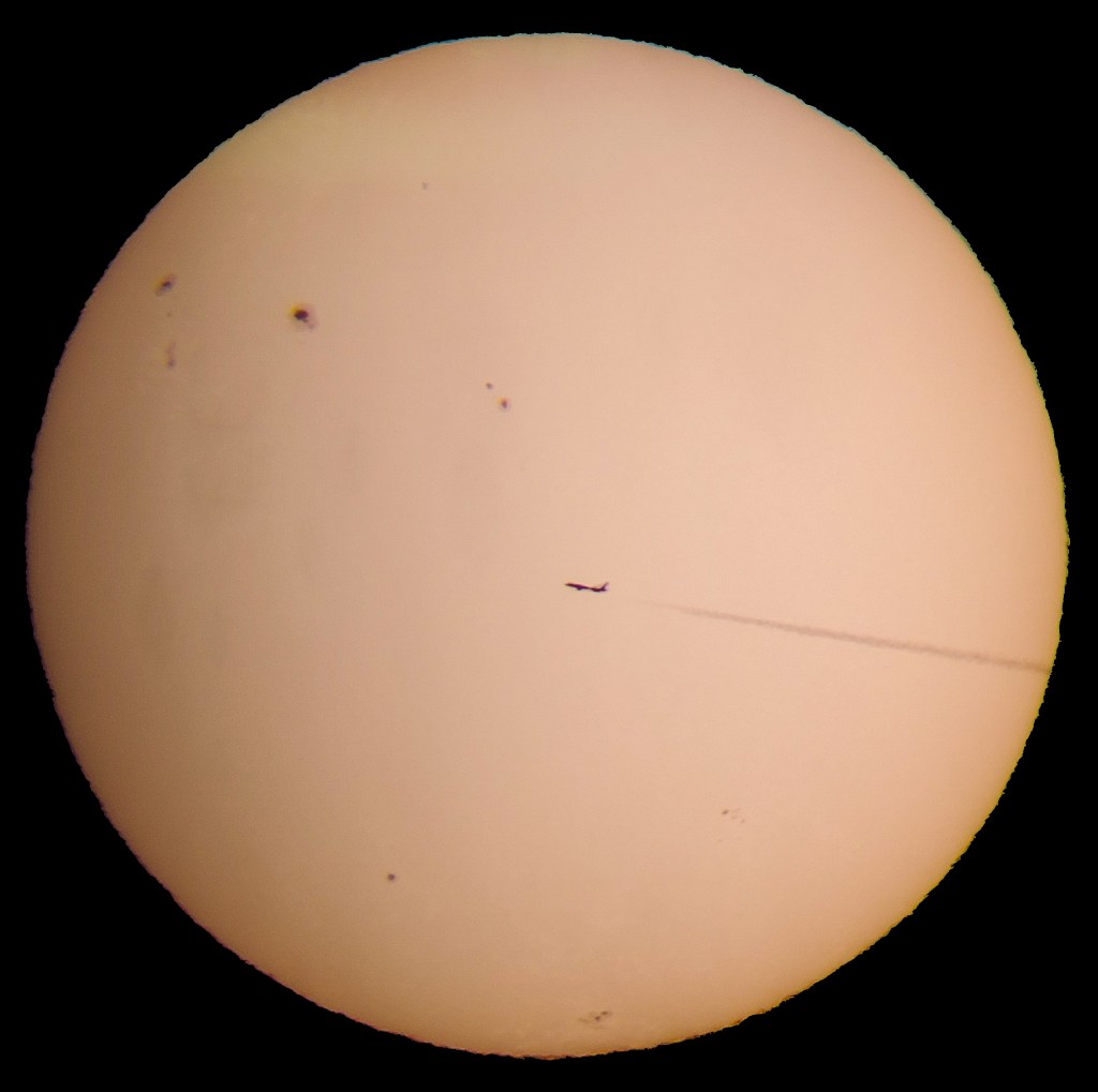 Tokrat sem skorajda zgrešil Sončni vzhod. Sem pa zato imel srečo, da sem samo v 5 minutah slikal kar dva avijona, ki sta navidezno prečila Sonče. Prvi avijon je bil Airbus A340 na Lufthansinem letu DLH767 iz Mumbaja v Minhen: https://www.flightradar24.com/2024-08-29/05:10/20x/DLH767/36dadcbe. Lepo se vidi 4 izpušne sledi 4-ih motorjev letala A340. Za letalo na drugi sliki nisem sigurn: še najbolj verjetno je šlo za Ryanairov let RYR4373 iz Poznana v Palermo: https://www.flightradar24.com/2024-08-29/05:04/20x/RYR4373/36dbcde4. Če to drži, je bilo letalo v momentu slikanja, kar 104 km stran od mene – nad Slovenski Bistrico – kar pa je čisto možno glede na majhnost letala na sliki. Ni čisto naključje, da sem ujel avijone pri prehodu Sonca. Namreč, nekaj deset minut po vzhodu je Sonce na višinah 5 -15 ° nad obzorjem. Na teh višinah pa so v tem času tudi navidezno nahajajo številna letala v pasu oddaljena od mene 50-100 km, ki letijo na normalnih potovalnih višinah (10 -12 km). Zato je precej velika verjetnost, da v tem času kakšno letalo navidezno preleti Sonce.