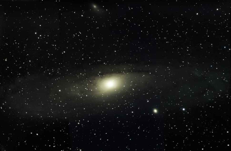 Ker je ta galaksija tako velika, sem moral narediti mozaik slik: v času štirih noči sem posnel 730 slik z ekspozicijo 10 sekund. Pa še vedno nisem zajel čisto cele galaksije. Na sliki sta vidni tuidi eliptični satelitski galaksiji M 32 in M 110; in pa zvezdni oblak z imenom NGC 206. Torej je ta galaksija tako blizu, da tudi z majhnimi teleskopi v njej lahko razločimo druga nebesna telesa.