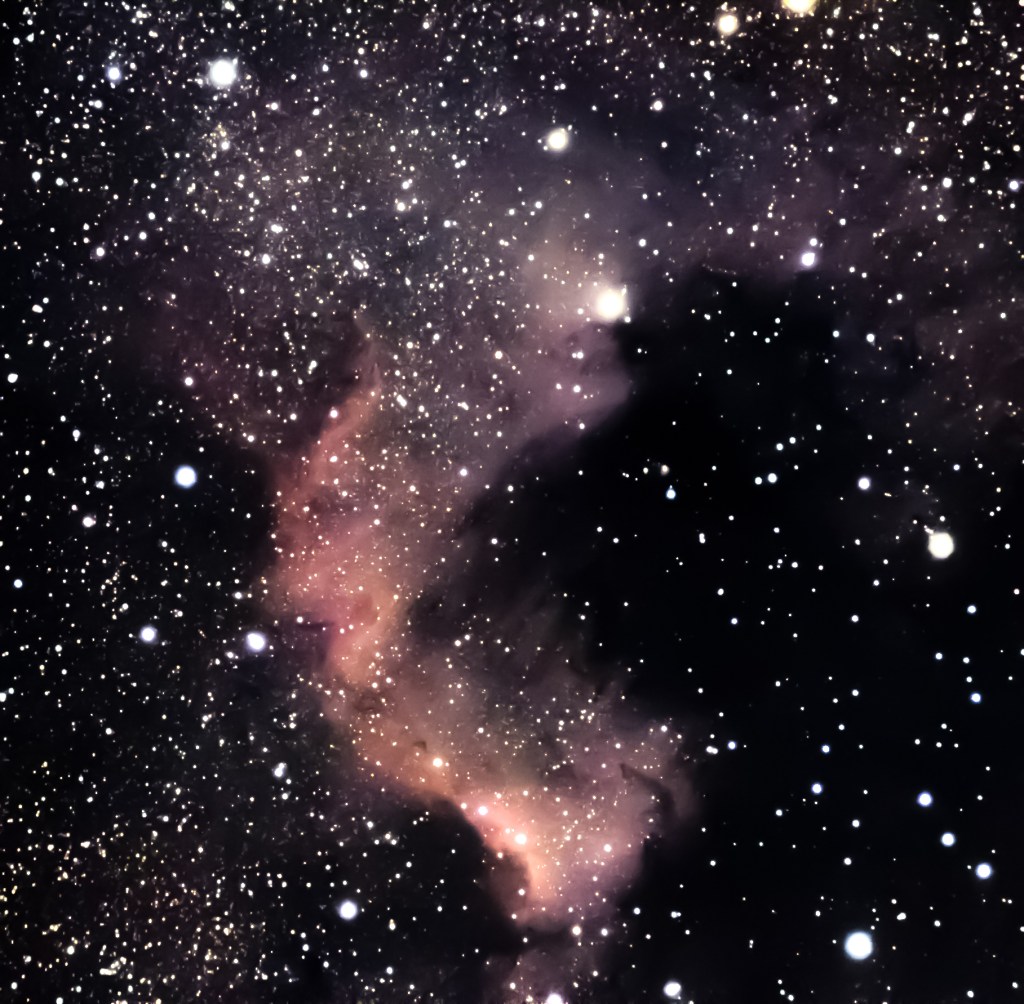 Emisijska meglica Severna Amerika (NGC 7000) je po mojem mnenju ena najlepših meglic na nebu. Razteza se na ogromnem območju velikosti 10 premerov polne Lune v ozvezdju Laboda na mestu, kjer ozvezdje prečka Rimska cesta. V resnici je meglica še večja, saj gre za isto območje plina in prahu, kot je sosednja meglica Pelikan, ki pa ju samo na videz loči temno območje prahu. Meglica je dobila ime, zaradi zelo značilne oblike, ker je zelo podobna Severno-Ameriškem kontinentu: razloči se celo Mehiški zaliv, ki je nekoliko temnejši del meglice. Meglico lahko pod temnim nebom vidimo v vsakem daljnogledu, s katerim se nam lepo prikaže njena siva silhueta (barv meglic pa v daljnogledih in teleskopih seveda ne vidimo). Dejansko je zaradi velikosti meglico težje vizualno videti v teleskopu, kot z daljnogledom. Ker je meglica tako zelo ogromna, je nisem mogel fotografirati hkrati, ampak sem moral sestaviti mozaik. Pa še to sem jo v eni moči uspel poslikati manj kot tretjino. Slikal sem samo najbolj značilen del okrog Mehiškega zaliva. Zato na moji sliki nima tako lepe “Severno-Ameriške” oblike, kot če bi jo slikal celo. Skupaj sem posnel 427 slik z 10 sekundnimi ekspozicijami. Ko bo še več jasnih noči, bom poslikal še preostali del.