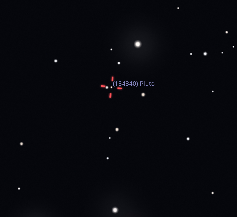 Moja slika Plutona v primerjavi z zvezdno karto iz programa Stellarium s katerim sem sploh ugotovil katera “zvezdica” je Pluton. Zvezdica levo od Plutona po podatkih Stellariuma sveti s 13,7 magnitudo.