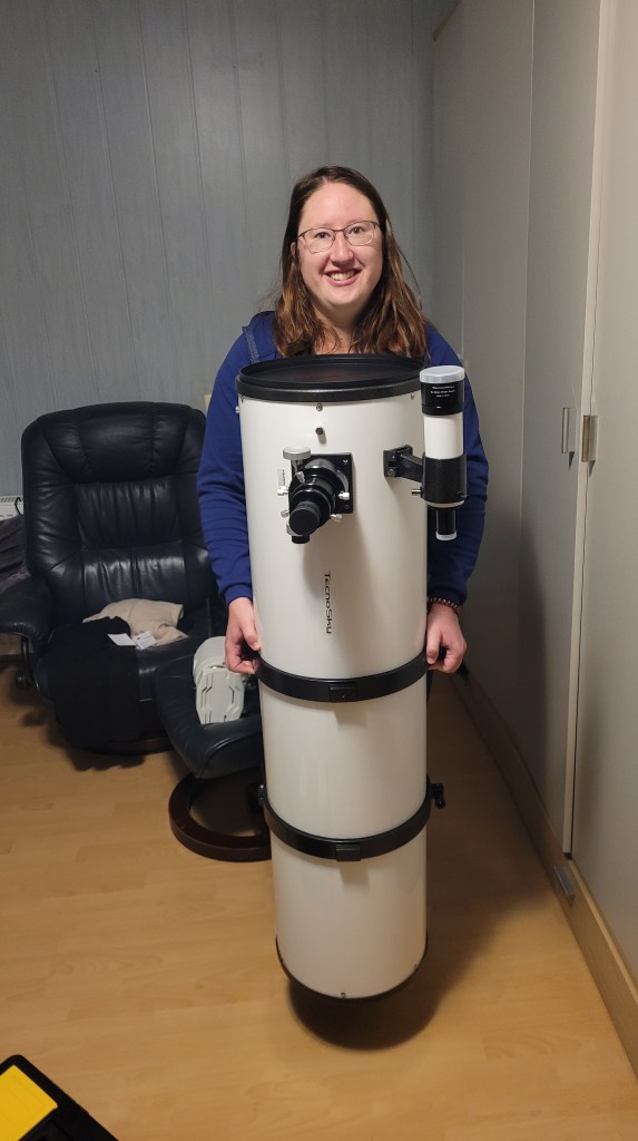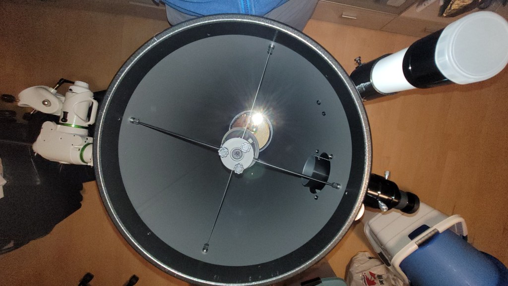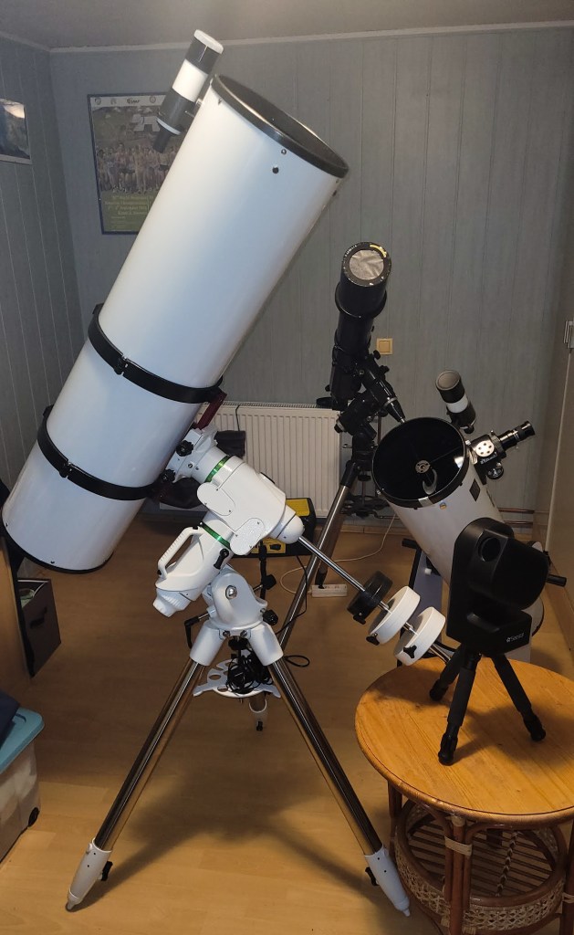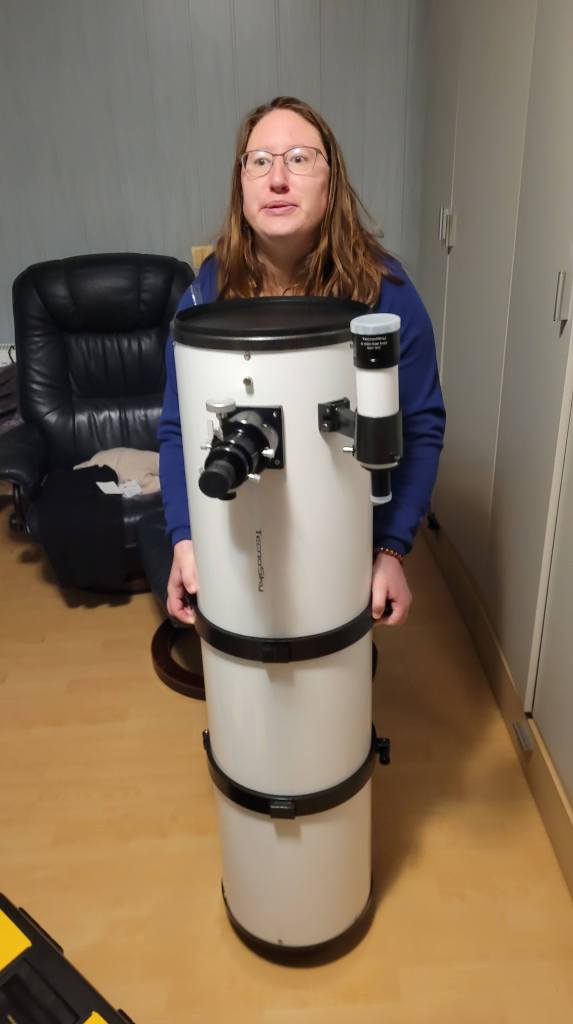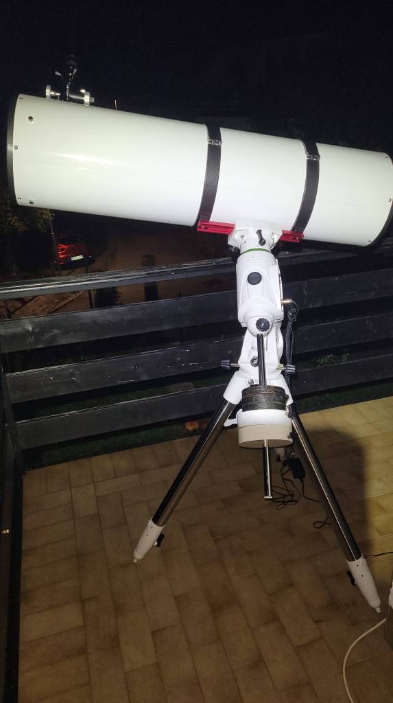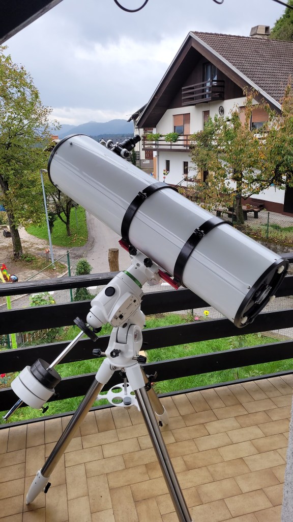 Nabavil sem si teleskop: Newtonov reflektor GSO 254 mm (10″)/1270 mm (F5) na Sky-Watcher EQ6-R Pro računalniško vodeni ekvatorialni Go-To montaži. Za slikanje sem kupil namensko astronomsko CMOS kamero Player One Uranus-C. Cev teleskopa je dolga 1150 mm in tehta 15,5 kg, montaža na kateri stoji teleskop pa tehta okoli 36 kg. Ko je na teleskop vse priklopljeno tako, da deluje, cel sistem skupaj tehta okoli 60 kg in meri nekje okoli 2 m v višino. Ideja je da bom z njim lahko slikal tako planete, kot tudi meglice in galaksije. Veliko 10 inčno primarno zrcalo teleskopa mi bo to omogočal, da bom videl velik del teh objektov. Teleskop je v vseh pogledih za nekaj redov velikosti večji in bolj zmogljiv od mojih ostalih treh teleskopov. Na blogu boste lahko brali kaj mi bo uspelo z njim videti in fotografirati. Meni pa bo hitreje mineval čas, ki bi bil brez tega, zaradi bolezni, povsem stran vržen del življenja. Tudi Petra me pri tem podpira, ker ve da nujno potrebujem razvedrilo.
