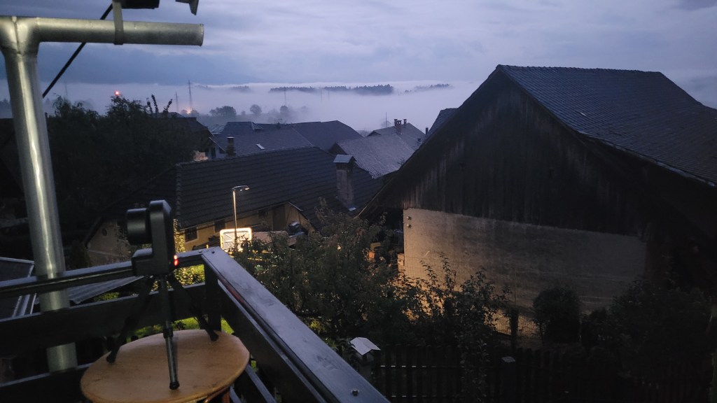 Danes zjutraj je bilo nebo precej jasno, le na vzhodnem obzorju, kjer bi moral biti viden komet je bilo povsem oblačno. Namesto kometa sem s Seestarjem slikal Veliko Orionovo meglico (M42/M43) in pa Lunin krajec s starim refraktorjem. Na prvi preizkus novega teleskopa bom moral počakati na lepše vreme.