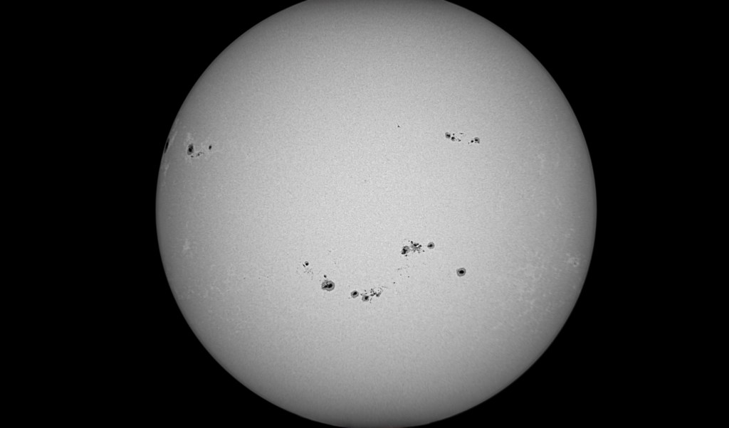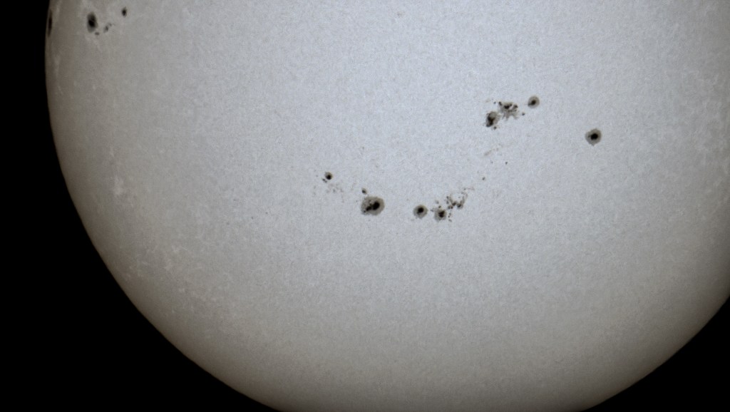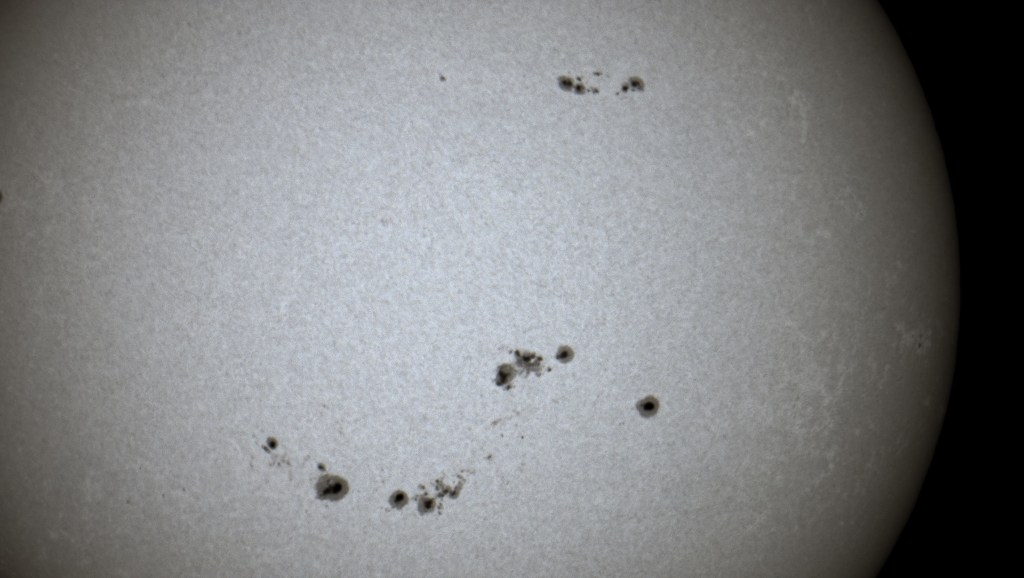 Sonce je spet zelo pegasto: Wolfovo število je danes kar 288. Poleg tega so glavna skupine peg obrnjene proti nam. Tako, da v kolikor v naslednjih dneh katera izmed njih izbruhne, bomo lahko konec tedna spet videli severni sij. Tokrat sem prvič slikal Sonce z s ta velikim teleskopom. Najprej me je bilo kar malo strah. Pri opazovanju Sonca je bolje nekoliko več previdnosti, kot manj, ker trenutek nepazljivost in si slep. Zato sem solarno folijo tako močno prišraufal na tubo teleskopa, da bi se verjetno teleskop prej podrl. Ker je filter velik kot škatla za pico, me kar malo skrbi, da bi mi ga preluknjal kakšen nenaden močnejši sunek vetra. No, danes vetra na srečo ni bilo; niti sapice ne.
