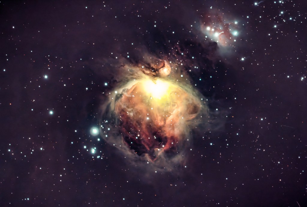 Orionova meglica (M 42) je največja in najsvetejša meglica na nočnem nebu. Z lahkoto jo najdemo, saj leži v Orionovem meču. Je edina meglica na nočnem nebu, ki je vidna s prostim očesom in edina meglica, ki je v amaterskih teleskopih vidna v barvah. Njena prava lepota se pokaže šele na fotografiji. Meglica ima navidezni premer 2×2 polnih Lun. V resnici pa meri v premeru 12 svetlobnih let. Je pomembna meglica, ker gre za porodnišnico novih mladih zvezd. Z največjimi teleskopi na svetu so uspeli posneti v meglici protoplanetarne diske – osončja v začetni fazi nastajanja in zato je Orionova meglica odločilno prispevala k našem razumevanju nastanka in življenja zvezd: https://science.nasa.gov/mission/hubble/science/science-highlights/finding-planetary-construction-zones/. To je možno izključno zato, ker meglica leži le 1300 svetlobnih let stran od Sonca in je del istega (Orionovega) kraka naše Galaksije. Malo nad Orionovo meglico leži še De Marianova meglica (M 43). Še malo severno v isti smeri pa leži slavna meglica Konjska glava, o kateri sem že pisal: https://bojanambrozic.com/2024/10/06/meglica-konjska-glava/. To pa še zdaleč niso niso edine meglice v Orionu. Praktično cel Orion je prepreden z meglicami – ravno zato, ker je to območje naša neposredna galaktična soseščina.