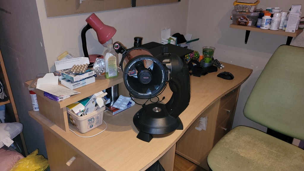 DRUGI PORAŽENEC: Teleskop, ki ga uporabljam kot tretjega po vrsti največ, je 254 mm GSO Newtonov reflektor. To je daleč največji in najtežji teleskop, ki ga imam. Zato, da ga postavim samo na balkonu potrebujem od 20 do 30 min. Teleskop je prevelik, da bi ga znosil na balkon v enem kosu, ampak gre tja v 6 delih: stojalo, montaža, optična cev in še dva kovčka dodatne opreme ter laptop. Teleskop je tako težak, da ko je enkrat postavljen ga moram nujno razstavit (pri vseh ostalih mi to ni treba), če ga želim premaknit recimo za 2 m na drug del balkona, da bi videl drugo območje neba. Potem, ko je teleskop postavljen, potrebujem še dodatne pol ure, da vse na teleskopu nastavim (kolimacija, polarna nastavitev, kamera), da je nared za uspešno slikanje. Torej potrebujem okoli eno uro, da sploh lahko začnem resno opazovati. Potem pa je od mene in mojega zdravja odvisno kako dolgo zdržim dejansko opazovanje. Običajno ne prav dolgo, ker postanem utrujen in me začne zebsti. Če sem sredi enega izmed še slabših obdobij v moji bolezni, niti ne razmišljam, da bi teleskop postavljal, ker enostavno to zahteva veliko veliko preveč napora. V tem primeru pač postavim Seestar in imam vsaj nekaj od jasne noči.