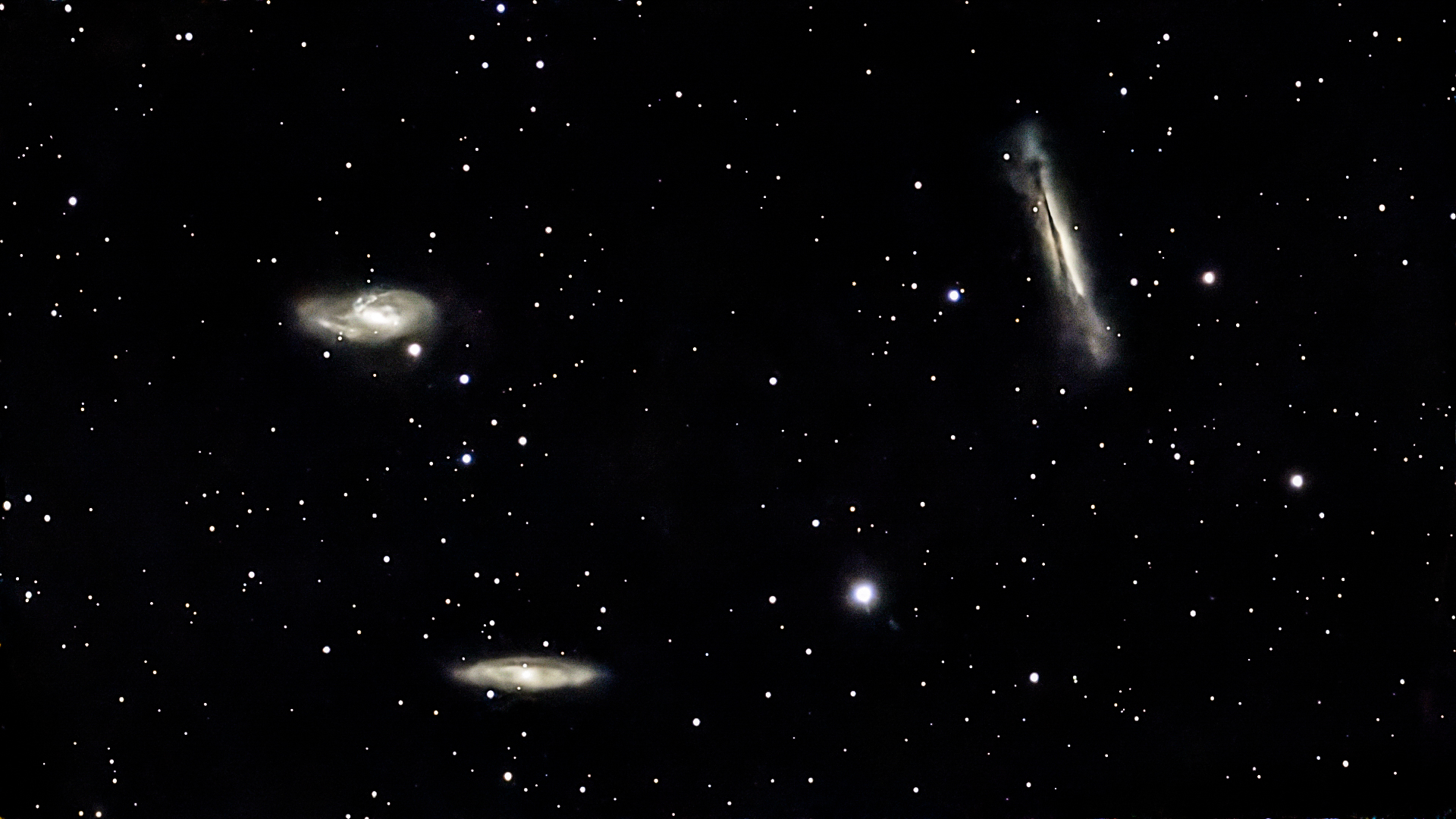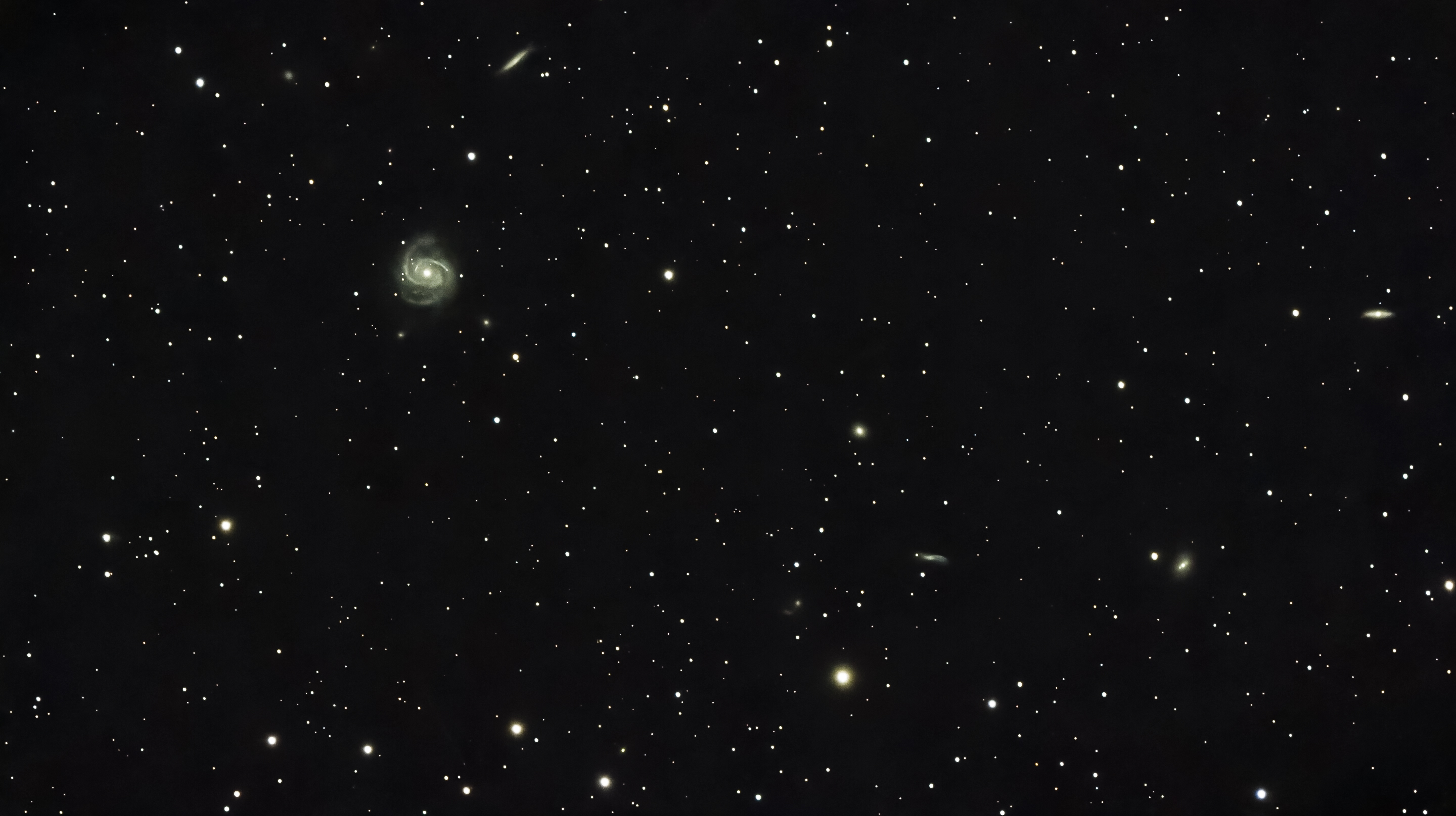 Doslej sem galaksije slikal samo z malim teleskopom Seestarjem. To zato, ker mi ni in ni uspela polarna nastavitev mojega 10-inčnega Newtona. Zato teleskop ni sledil nebu in nisem mogel slikati pri daljših ekspozicijah. Iz balkona, kjer opazujem ne vidim Severnice. Zato je polarna nastavitev izjemno zahtevna. Poleg tega je balkon tudi nagnjen v eno smer. Več kot 7 mesecev sem se zafrkaval, nešteto noči sem vrgel preč, ker mi zadeva ni delala. Res frustrirajoče! Ker ne vidim severnice, je moral biti aligment povsem elektronski. Uporabil sem program N.I.N.A. Sedaj mi pa je končno uspelo! Teleskop mi dovolj dobro sledi nebu za do 10 sekund dolge posnetke. Za daljše ekspozicije bom verjetno moral nabaviti autoguiding. Spodnji sliki spiralnih galaksij sta sestavljanka 2 ure posameznih 10 sekundnih posnetkov. Na prvi sliki sta galaksiji M65 in M66 v Levu. Na drugi pa je Galaksija M100 – z imenom Sušilec za lase. Zelo lepa galaksija s neposrečenim imenom. Ker gre za galaksijo iz Jate v Devici, jo obkroža še ducat manjših galaksij.
