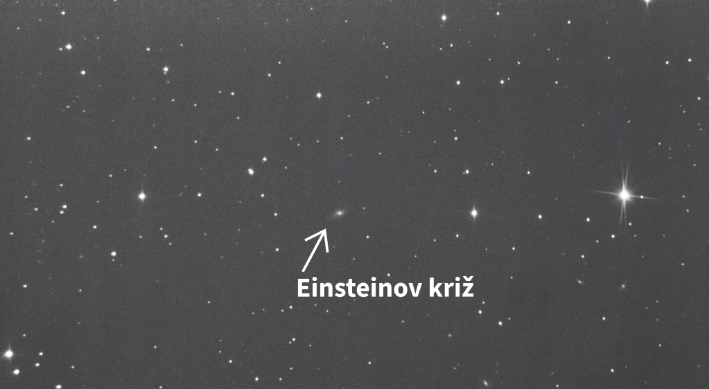 Einsteinov križ: je ekstremno zanimiv astronomski pojav, ko kvazar QSO 2237+0305 (zelo oddaljena aktivna galaksija) leži po čistem naključju leži točno za galaksijo ZW 2237+030. Posledica tega je pojav znan kot gravitacijsko lečenje: gravitacijsko polje galaksije deluje kot povečevalno steklo, ki poveča kvazar in ga prikaže v štirih identičnih slikah (v obliki križa) ob galaksiji. Moj teleskop nima ločljivosti, da bi lahko videl posamezne slike kvazarja. Zato prilagam Hubblovo sliko. Se pa jasno vidi celoten objekt, ki sveti s 16,8 magnitudo, kar pomeni da je približno 20.000 krat temnejši kot najtemnejši objekti še vidni s prostim očesom. Najtemnejše zvezde vidne na sliki pa so 20. magnitude. Galaksija ZW 2237+030 je od nas oddaljena 400 milijonov svetlobnih let, kvazar pa kar okoli 9 milijard svetlobnih let. Torej je svetloba zapustila kvazar 4 milijarde let preden je sploh nastalo naše Sonce. Če ET-ji na tem kvazarju trenutno gledajo proti nam, nas ne morejo videti, ker je za njih nastanek našega Osončja (in s tem planeta Zemlje) še skorajda 5 milijard let v prihodnosti. Objekt leži v bližini meje med ozvezdji Pegaz in Vodnar, in je trenutno v ugodni legi za opazovanje.