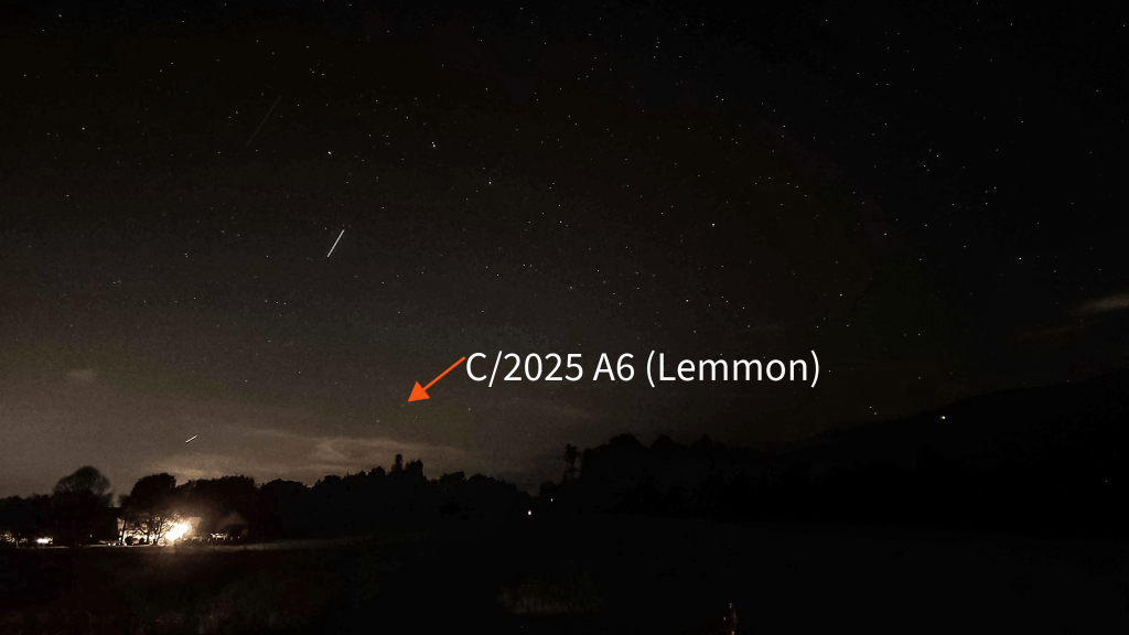 En cel mesec sem čakal na jasno noč, da sem lahko slikal kometa C/2025 A6 (Lemmon) in C/2025 R2 (SWAN). Pač Slovenija je država (za astronomijo)slabega vremena. Lemmon je nekje na meji vidnosti s prostim očesom in utegne v naslednjih dneh postati še nekoliko svetlejši. Trenutno se nahaja pod ročajem Velikega voza. slikal sem ga tudi z mobitelom. Medtem ko bo komet SWAN ostal v zgolj dometu teleskopov. Več o obeh kometih sem pisal že v eneem prejšnjih blogov: https://bojanambrozic.com/2025/09/17/bomo-oktobra-videli-dva-svetla-kometa-hkrati/.