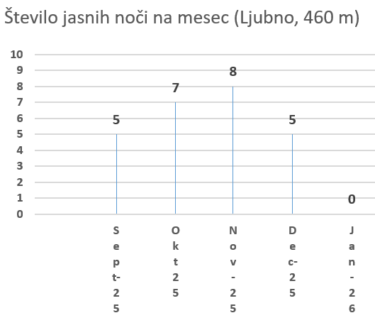 V Sloveniji imamo zaradi pogostega mešanja različnih zračnih mas in vpliva topografije izredno nepredvidljivo vreme, ki ni najbolj primerno za astronomska opazovanja. Vremenske napovedi Agencije za okolje (ARSO) so po mojem mnenju dobre. Ampak žal ARSO nima nobenih uradnih podatkov o številu jasnih noči, kar bi nas astronome zeli zanimalo. Prav tako ARSO ne izdaja namenskih vremenskih napovedi za nočni čas. ARSO beleži samo število jasnih dni. Jasen dan pa je po njihovi definiciji vsak dan, ko je več kot 80 % neba jasnega (zato da so možna astronomska opazovanja seveda mora biti 100 % neba jasnega). Po teh podatkih je na vremenski postaji letališče Lesce (ki je od mene oddaljena 5 km) vsako leto povprečno 67 jasnih noči. To je po mojem občutku veliko več od resnice. Zato sem septembra lani začel zase beležit število “pravih” jasnih noči. Pričakujem, da bom zabeležil nekje od 30 do 40 jasnih noči na leto. Od teh dni jih vsaj še 10 dni ne bo primernih za večino astronomskih opazovanj, ker bo motila Luna. Tako da je v Sloveniji verjetno nekje 20 do 30 dni letni, ki so primerna za astronomijo. In glede na dosedanje podatke (graf spodaj) kaže, da so bila moja predvidevanja pravilna. No, letošnji januar je prvič, da cel mesec ni bilo niti ene jasne noči. Zadnja jasna noč se je zgodila 31. decembra. Glede na vremensko napoved se lahko zgodi da bo minilo več kot 40 zaporednih brez ene same jasne noči.