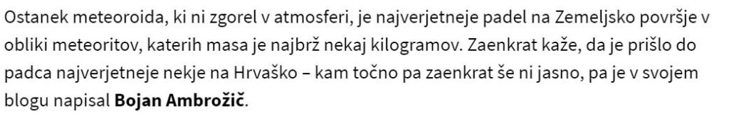 24ur.com, 25. 8. 2021: https://www.24ur.com/novice/znanost-in-tehnologija/v-blizini-reke-padel-meteorit-ne-iscemo-ga-ker-je-prenevarno.html