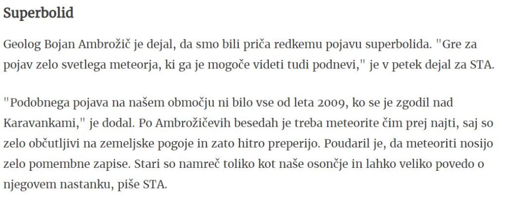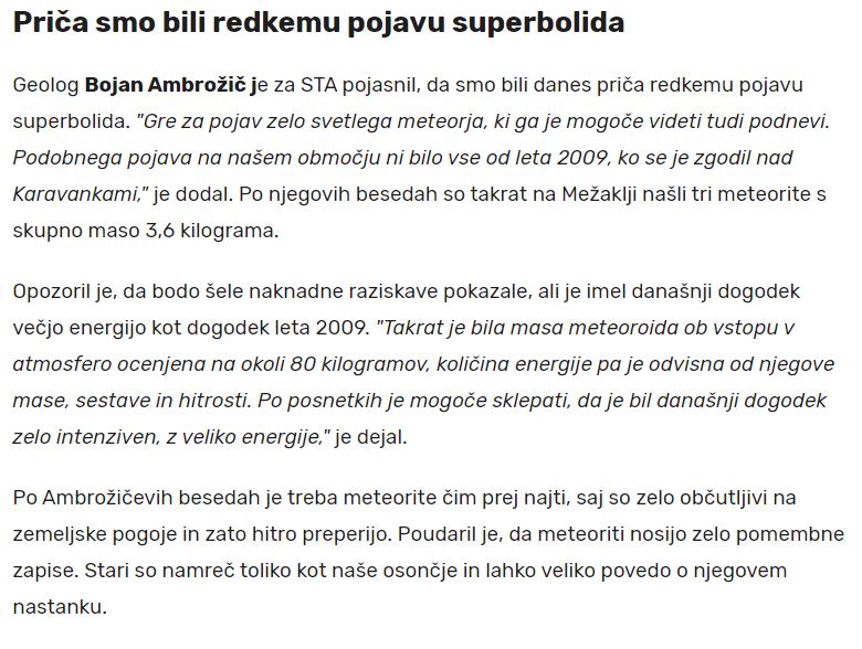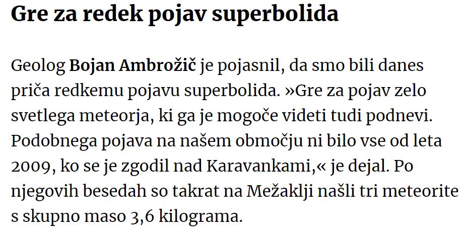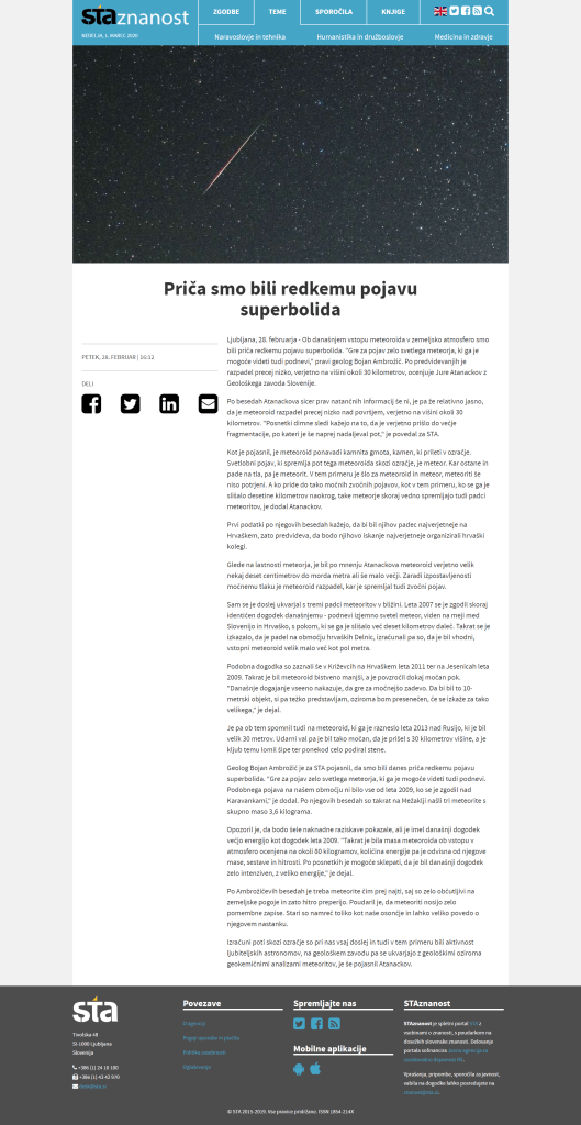 - STA: Priča smo bili redkemu pojavu superbolida: (28. 2. 2020): https://www.sta.si/2733147/prica-smo-bili-redkemu-pojavu-superbolida