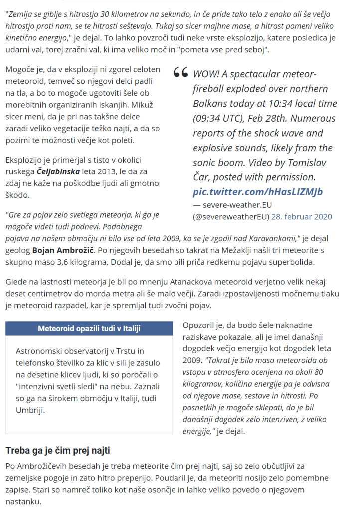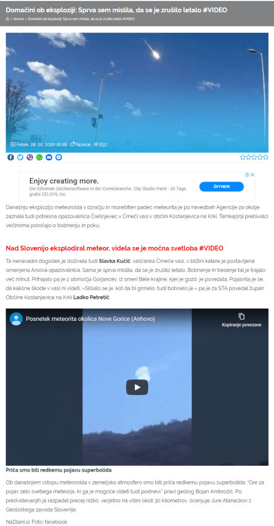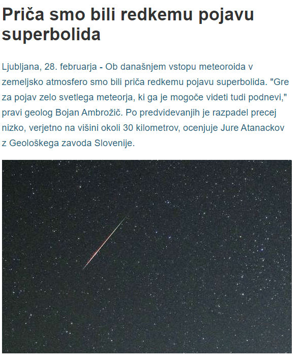 - Zurnal24.si: Nad Slovenijo in Hrvaško: Priča smo bili redkemu pojavu superbolida: https://www.zurnal24.si/slovenija/nad-slovenijo-eksplodiral-meteor-342561 (28. 2. 2020):
