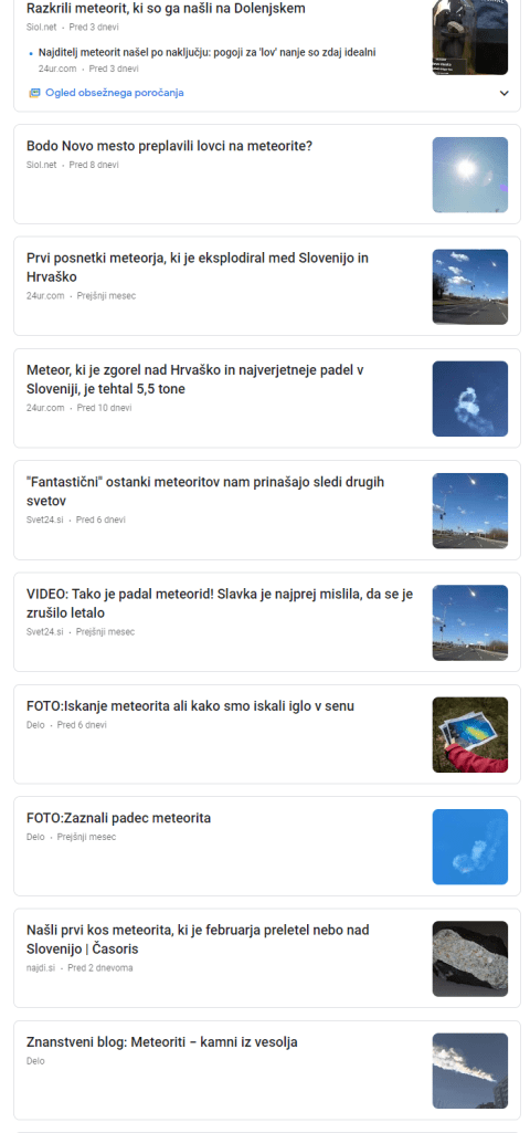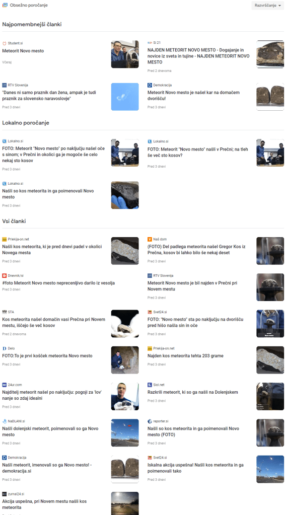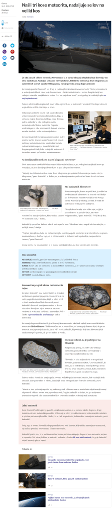 Siol.net, 26. 3. 2020: https://siol.net/novice/slovenija/nasli-tri-kose-meteorita-nadaljuje-se-lov-na-veliki-kos-521812
