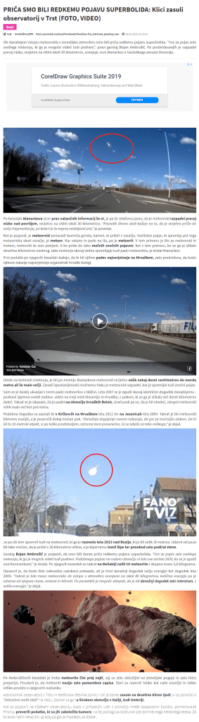 - Siol.net: Hrvaški znanstvenik: Meteor je tehtal 5,5 tone, ostanki naj bi padli na slovenska tla #video: https://siol.net/novice/slovenija/hrvaski-znanstvenik-meteor-naj-bi-tehtal-55-tone-video-519820?fbclid=IwAR1885Lkeqrvk4cdy7W9P4Ub6YGc1VdF0dZQjFFMQrUa9Evad5rCbWaFu3U (1. 3. 2020)