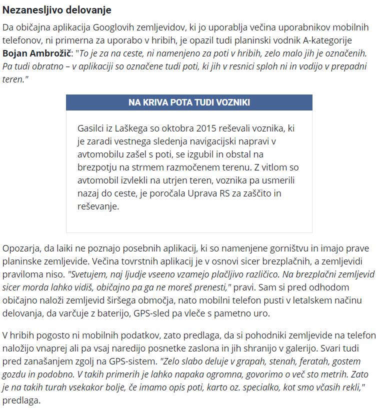 RTVSLO.SI: “Če je pot samo v telefonu, na terenu je pa ne vidiš, potem je ni, mar ne?”, 1. 9. 2020: https://www.rtvslo.si/tureavanture/planinski-izlet/ce-je-pot-samo-v-telefonu-na-terenu-je-pa-ne-vidis-potem-je-ni-mar-ne/534703